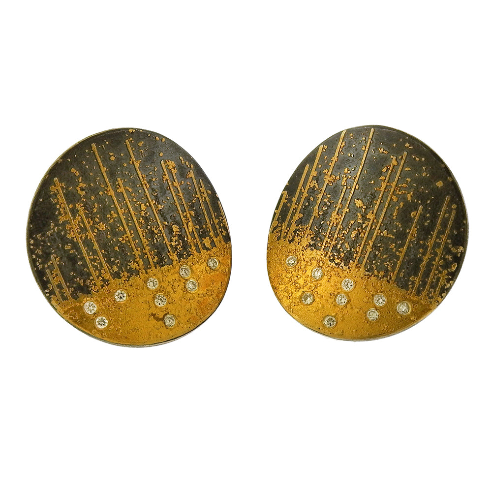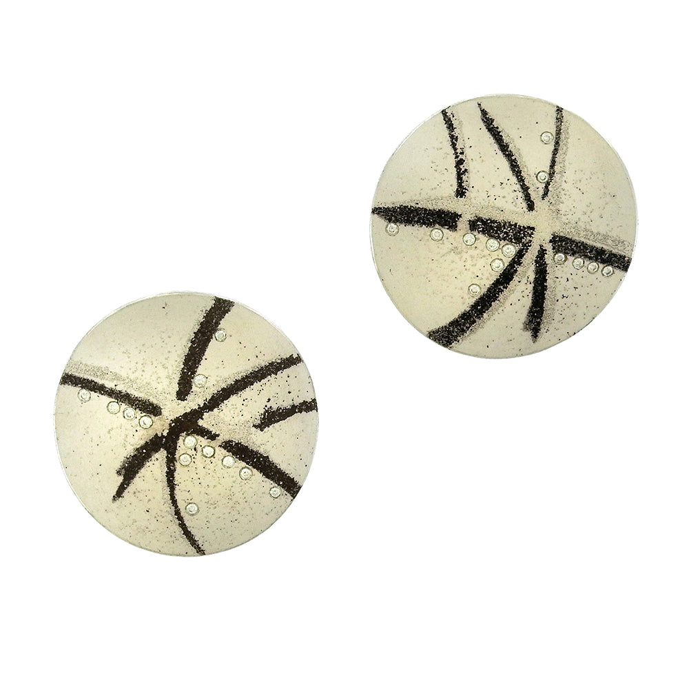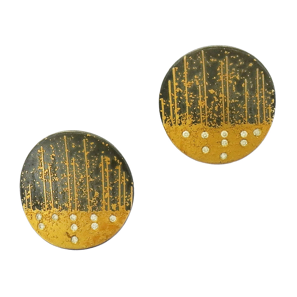 Fireworks for the ear, Atelier Zobel's bright silver curved earrings fused with palladium and oxidized sterling to create a lively pattern, accented with 0.26 carats diamonds, clip-on curved earrings measure 1-1/2" diameter.