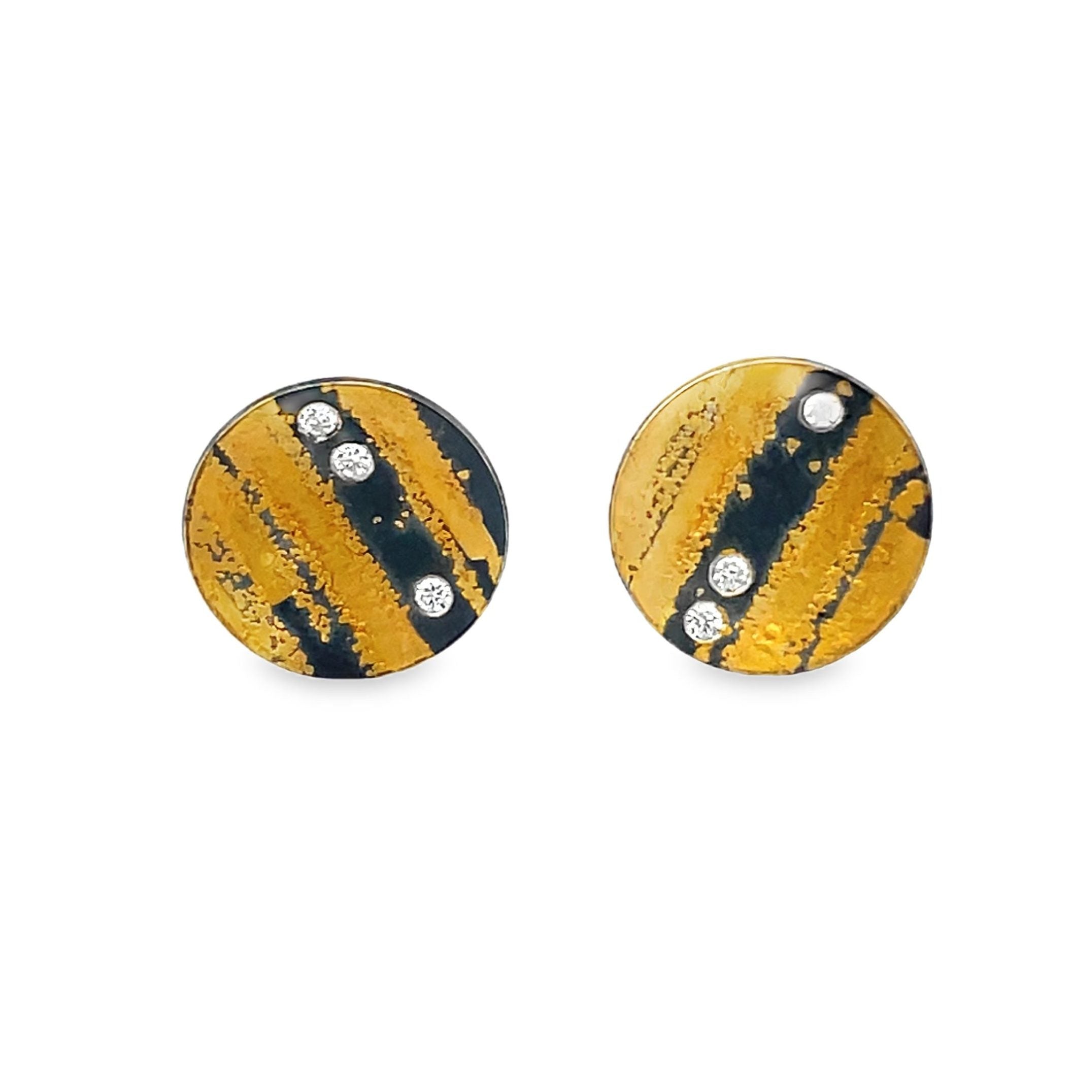 Gold, diamond and sterling slightly concave round earring studs by Peter Schmid are set with 0.06 cts tw diamonds, measure 1/2" in diameters, 18K gold backs.