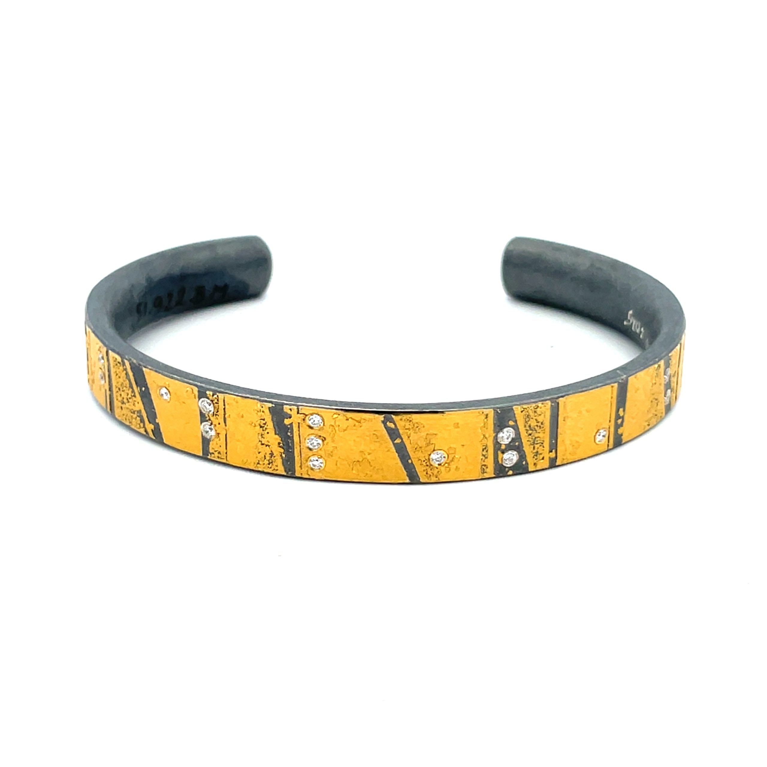 We love these cuffs from Atelier Zobel, in oxidized sterling silver, .14cts tw diamonds and 24K gold. Available in three sizes, shown here in medium, 3/8" wide, fits 6-12" to 6-34" wrist. Each bracelet is handmade and the pattern varies.