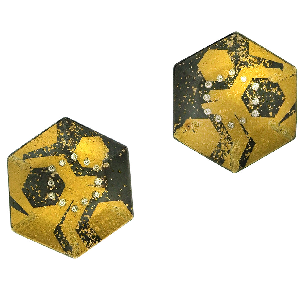 Peter Schmid's 'Nectar' earrings, 1-1/4" in diameter, are inspired by his collaboration with the Max Planck Institute on honeybees, the honeycomb shape earrings in oxidized sterling and 24K gold sprinkled with 0.24 cts champagne diamonds. 18K gold posts.