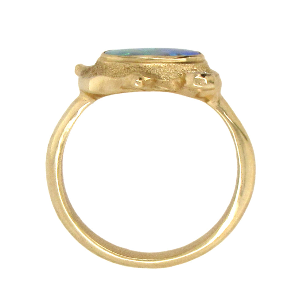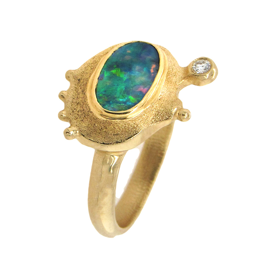 Delightful oval boulder opal ring by Audrius Krulis set in his signature sculptural style, with a white diamond accent. the ring measures 1/2" x 1/2" and is size 6.