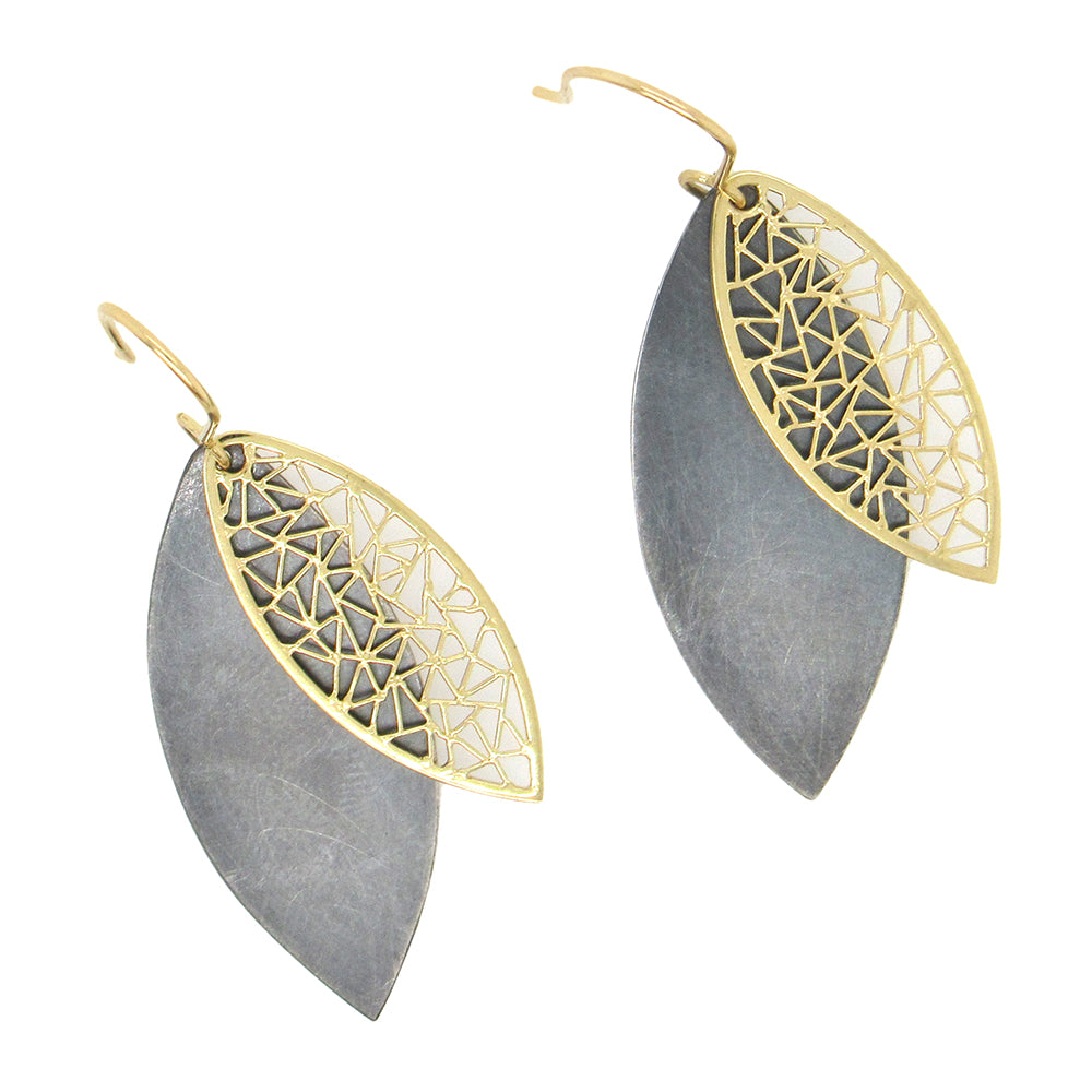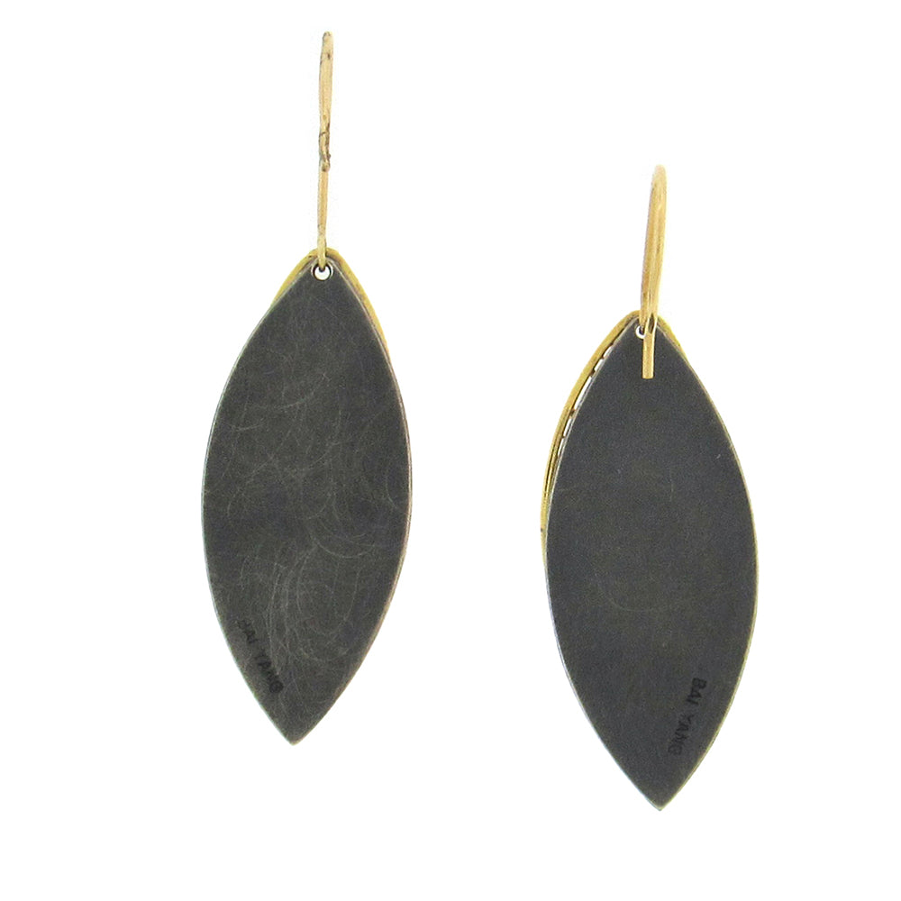 Baiyang Qiu fabricates the lacy gold mesh in her jewelry, here in a marquise shape, backed by oxidized sterling to create movement and contrast as the wearer moves. The earrings measure 1/2" x 1-3/4".