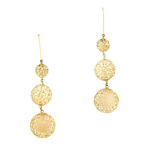 18K yellow gold open cage drop earrings from Baiyang Qiu are graduated from 6.5mm to 10.5mm,the largest bead set inside with a soft pink rose quartz bead. Earrings are 1-1/2" long.