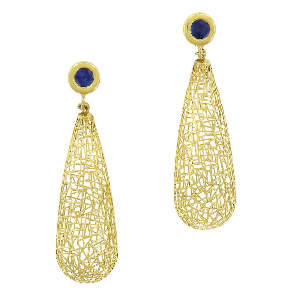 Baiyang Qiu 18K gold and sapphire teardrop earrings, 1/2" diameter x 1-3/4” long, are handmade with 18K gold wire, laser-riveted at each intersection in Qiu’s marriage of art and technology. The laser construction makes these airy cage designs strong and durable, set with fine blue sapphires at top, 0.85 carats tw.