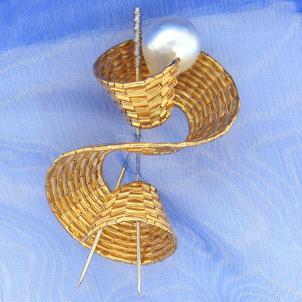 Double helix woven 18K and 22k gold brooch and pendant by Barbara Berk, circa 2005, is entirely made of gold in Berk's woven technique, to wear on a chain as a pendant or pinned, fibula-style- as a brooch with the platinum pins. From a private estate. Accompanied by original box.