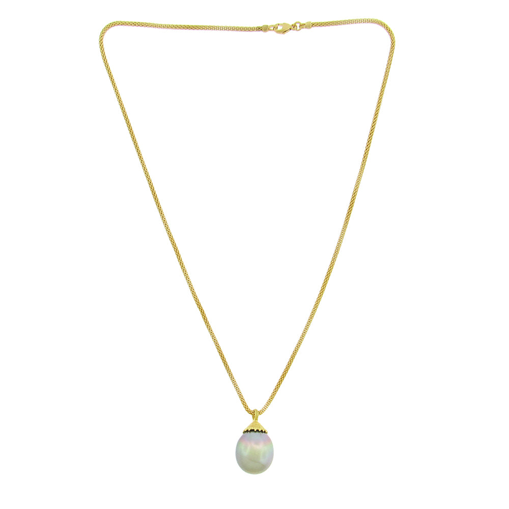 Barbara Heinrich creates an elegant necklace, setting a luminous iridescent silver-grey pear-shape Tahitian pearl, 14.5mm x 16mm, in a fluted 18K gold cap pendant, with 17" cage link chain necklace.