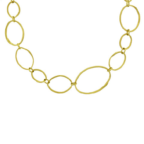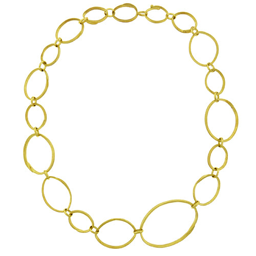 Barbara Heinrich's hand forged Olive Leaf necklace, each concave oval link wrapped and tapering to meet in a circle,graduating largest link to smaller at the back,18" long, to wear with the largest oval, 1-1/2" x 1", at front or side. .
