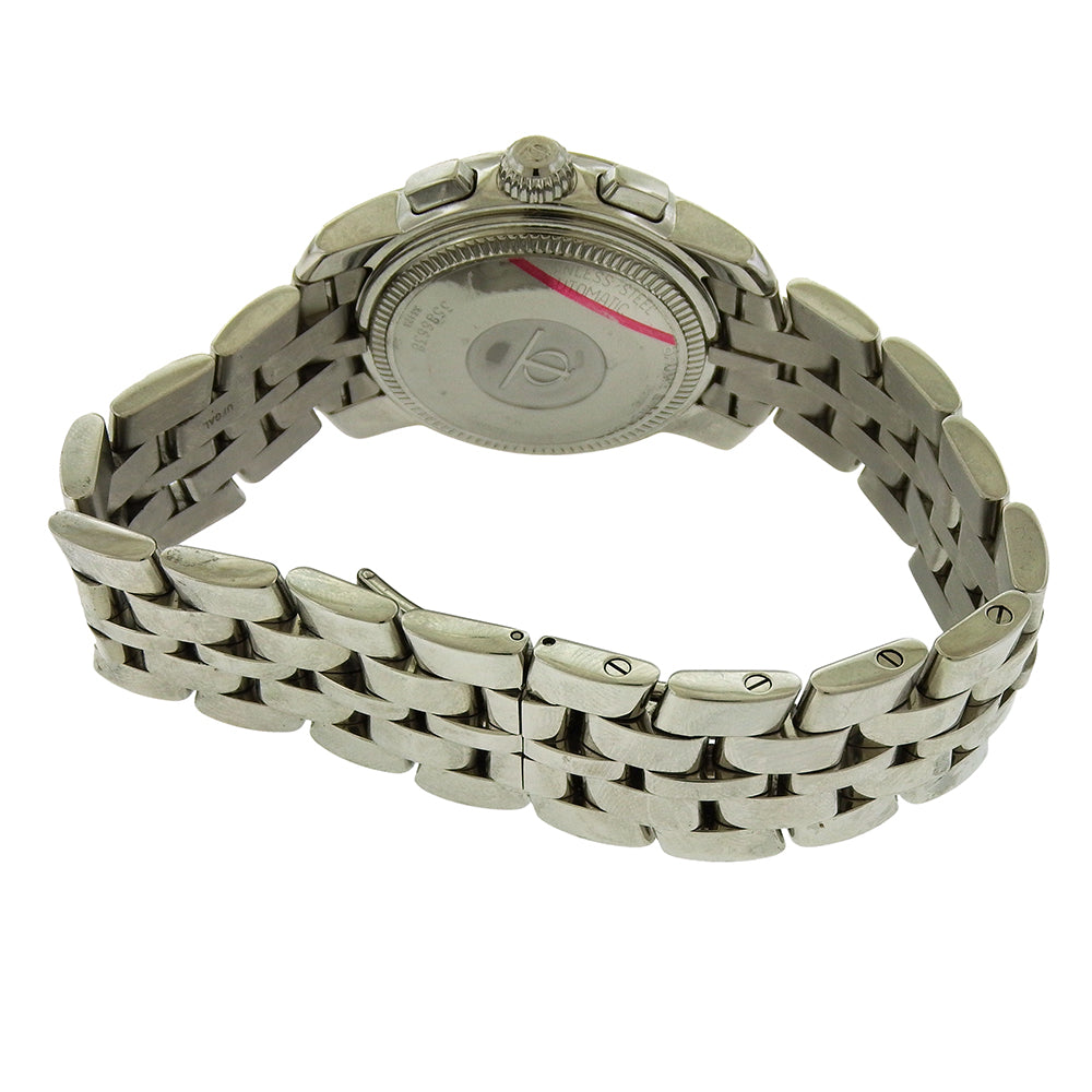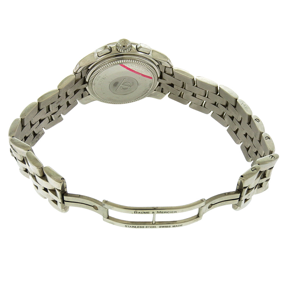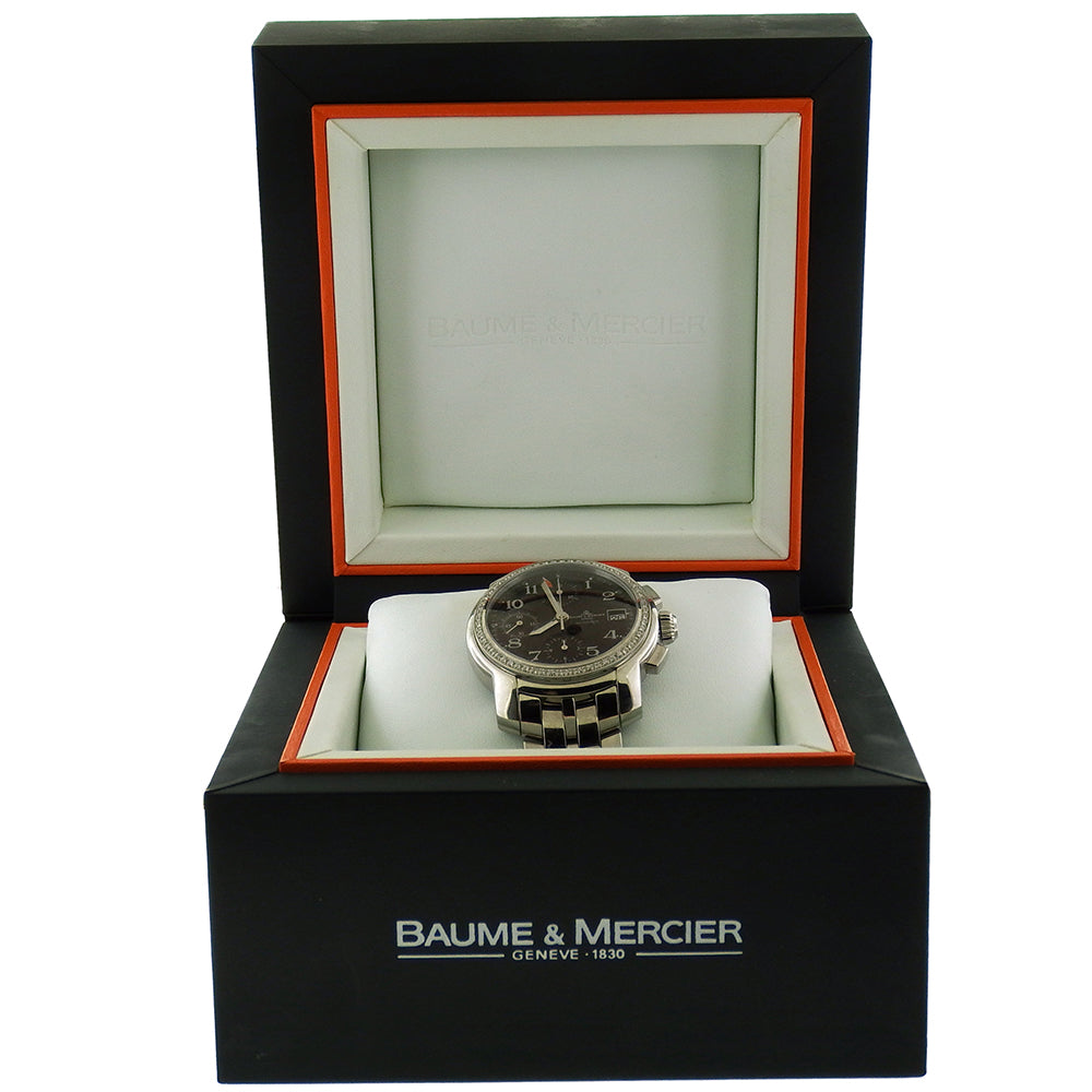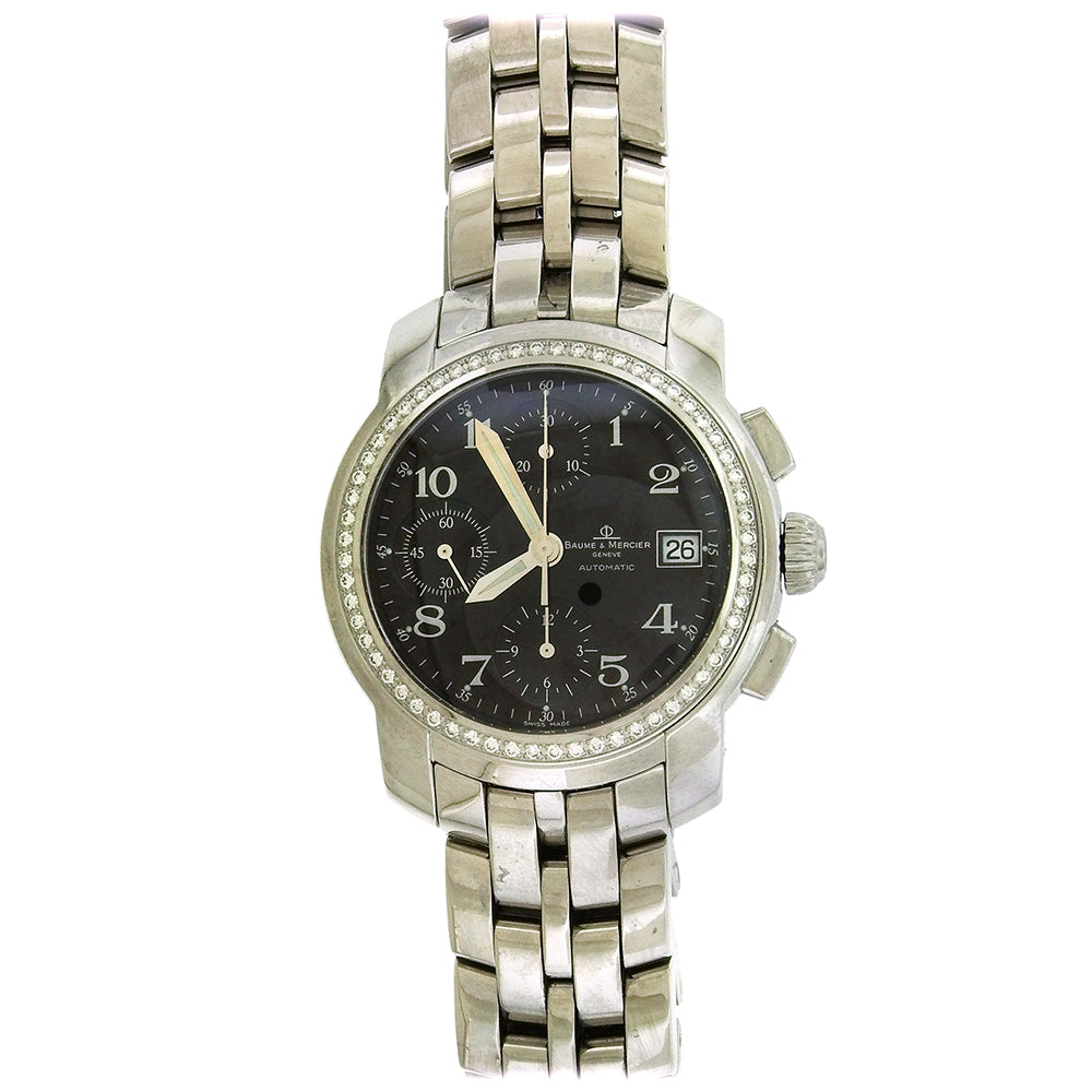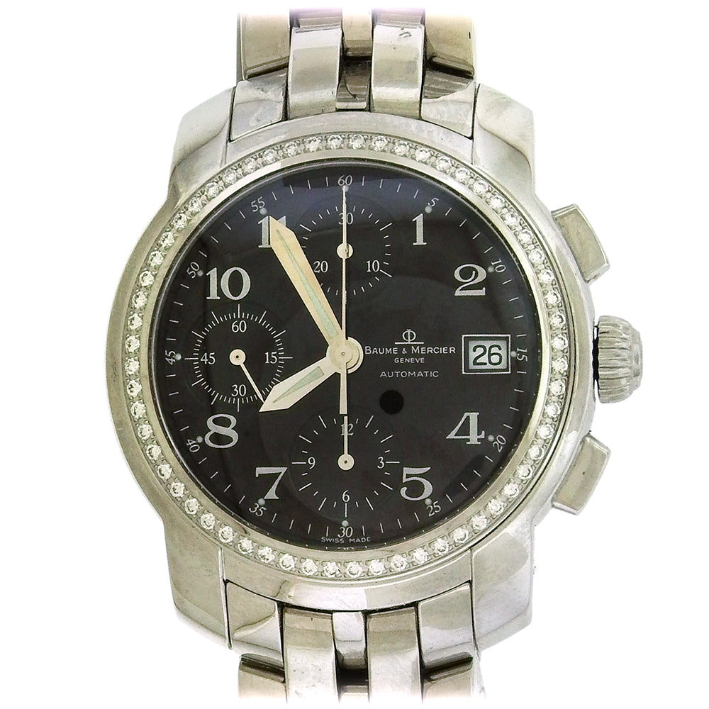 Stainless steel and diamond Baume & Mercier Capeland, Ref. 65425 circa 2004, is a self-winding date chronograph with steel bracelet and original box and papers. The 39mm case has a screwed-down back, water-resistant to 100 meters, diamond-set bezel, wedge-shape chrono buttons, black dial with applied silver gilt Arabic numerals, engine-turned constant seconds, 30 minutes and 12 hour registers, and date aperture at 3 o'clock. The automatic movement is warrantied by Aaron Faber for 12 months.