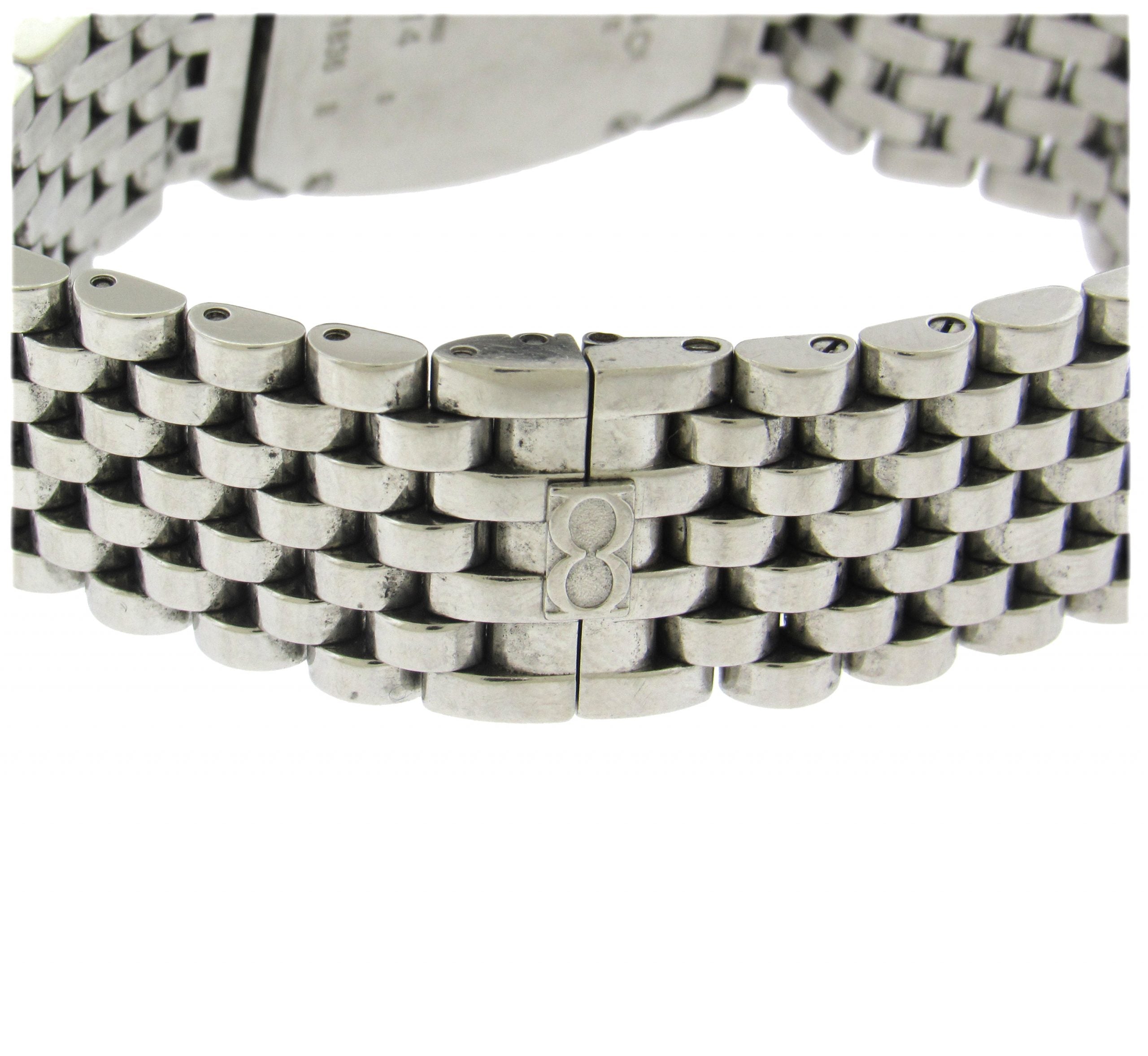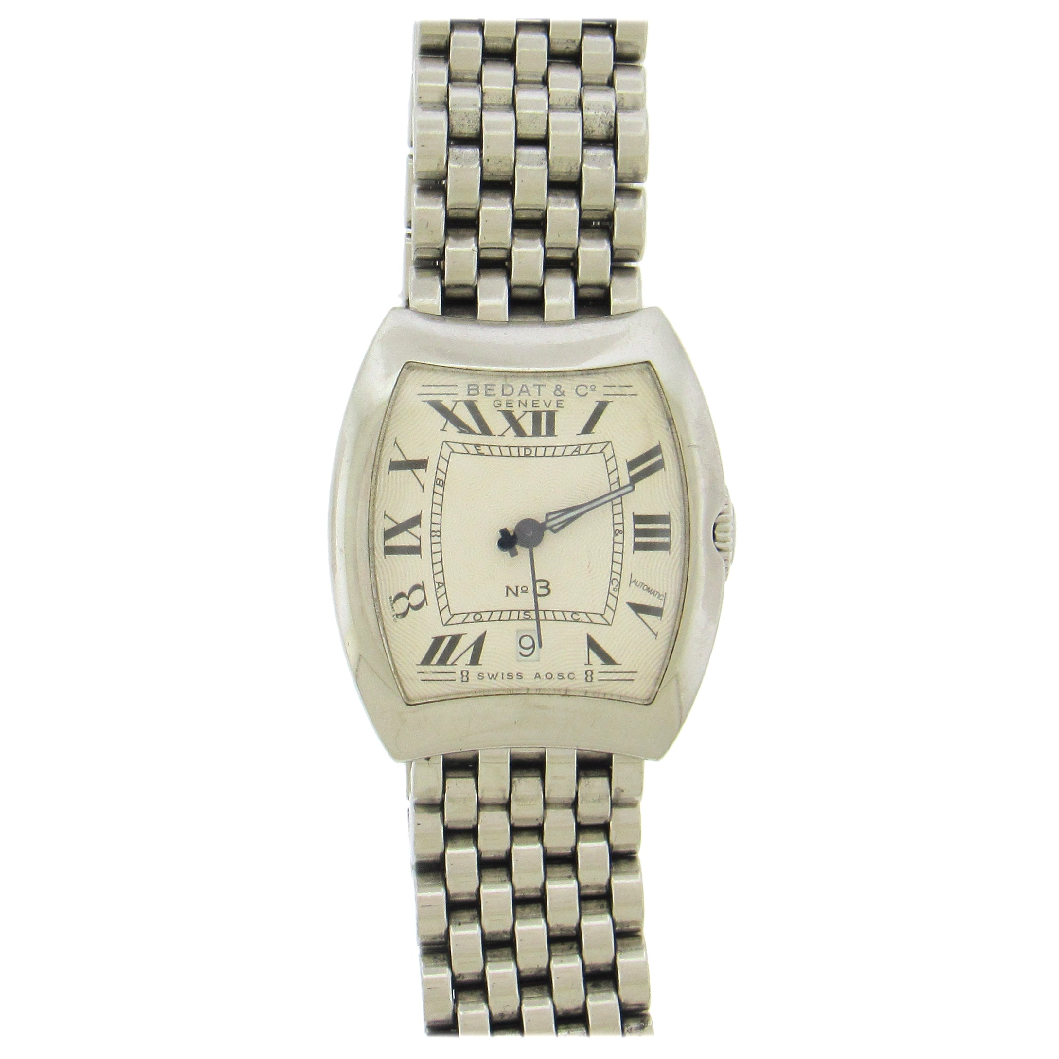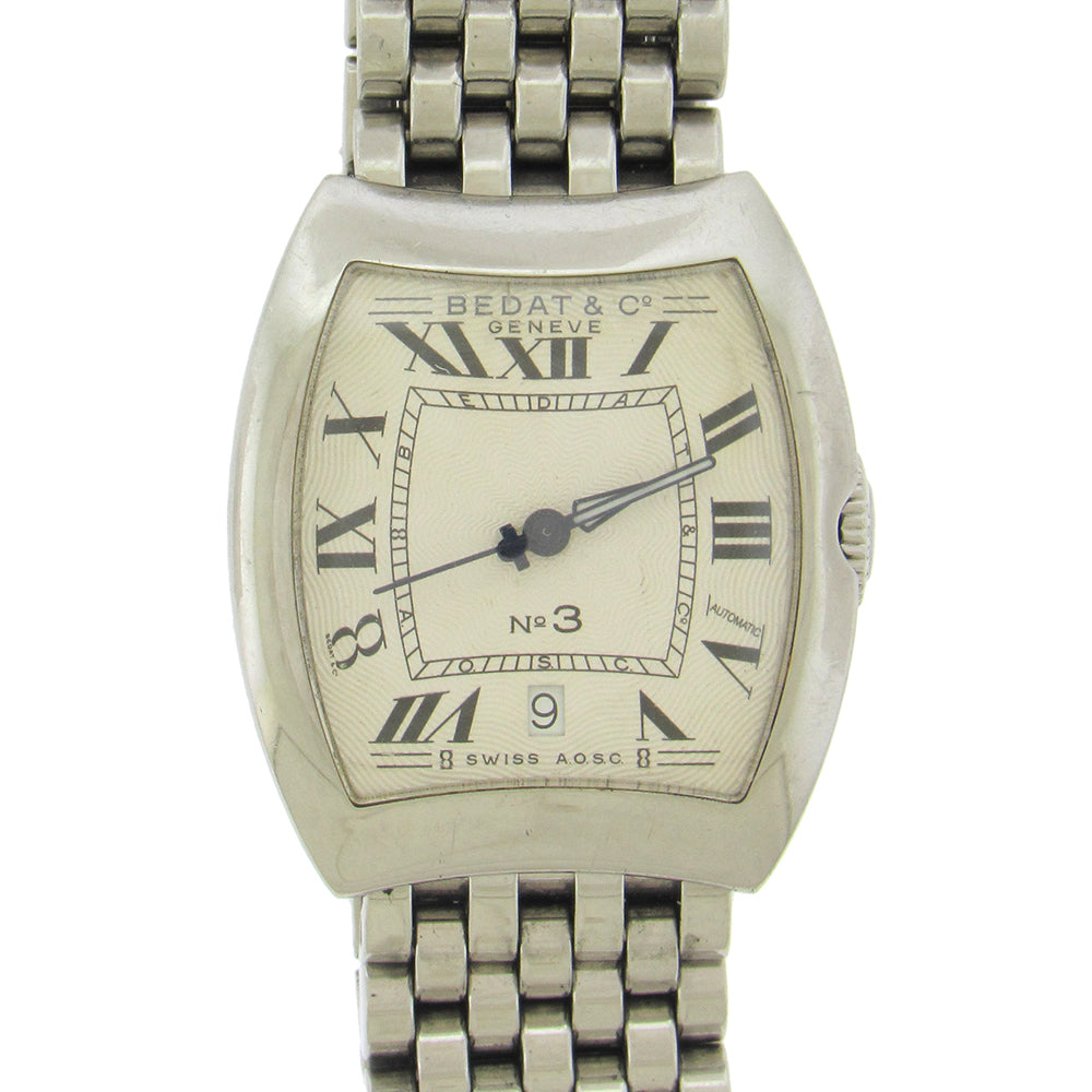 Stainless steel Bedat & Co., Genève, “No. 3”, 306,made in the 2000s, is a tonneau-shaped automatic sport wristwatch with date and a stainless steel Bedat & Co. link bracelet with a concealed deployant clasp. The case, 24mm x 32mm, has hooded lugs, flat bezel, recessed crown, case back with 4 screws, and sapphire crystal. The guilloché silver dial features painted black radial Roman numerals, outer minute track, blued steel arrow and baton hands. Automatic movement warrantied by Aaron Faber for 12 months, this is an excellent value for elegant everyday wear.