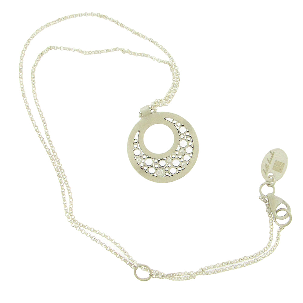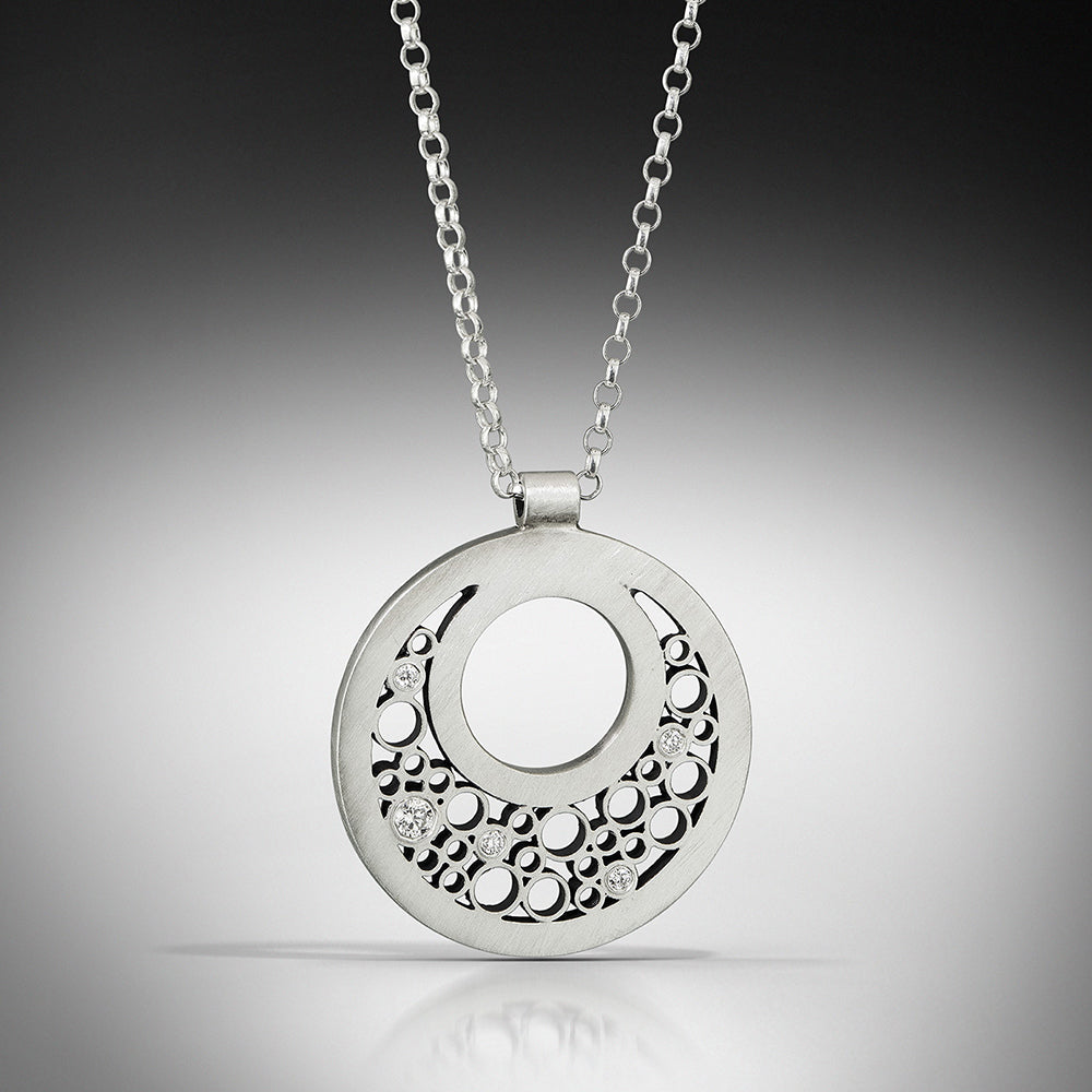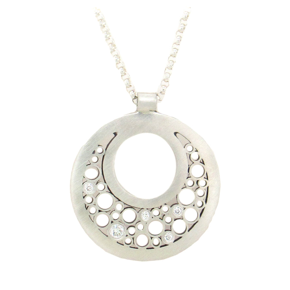 Belle Brooke's sterling 'Luz' pendant is set with 0.07 cts diamonds in the round crescent, on an adjustable sterling rolo chain, 16"-18" long, the pendant is 7/8" diameter.