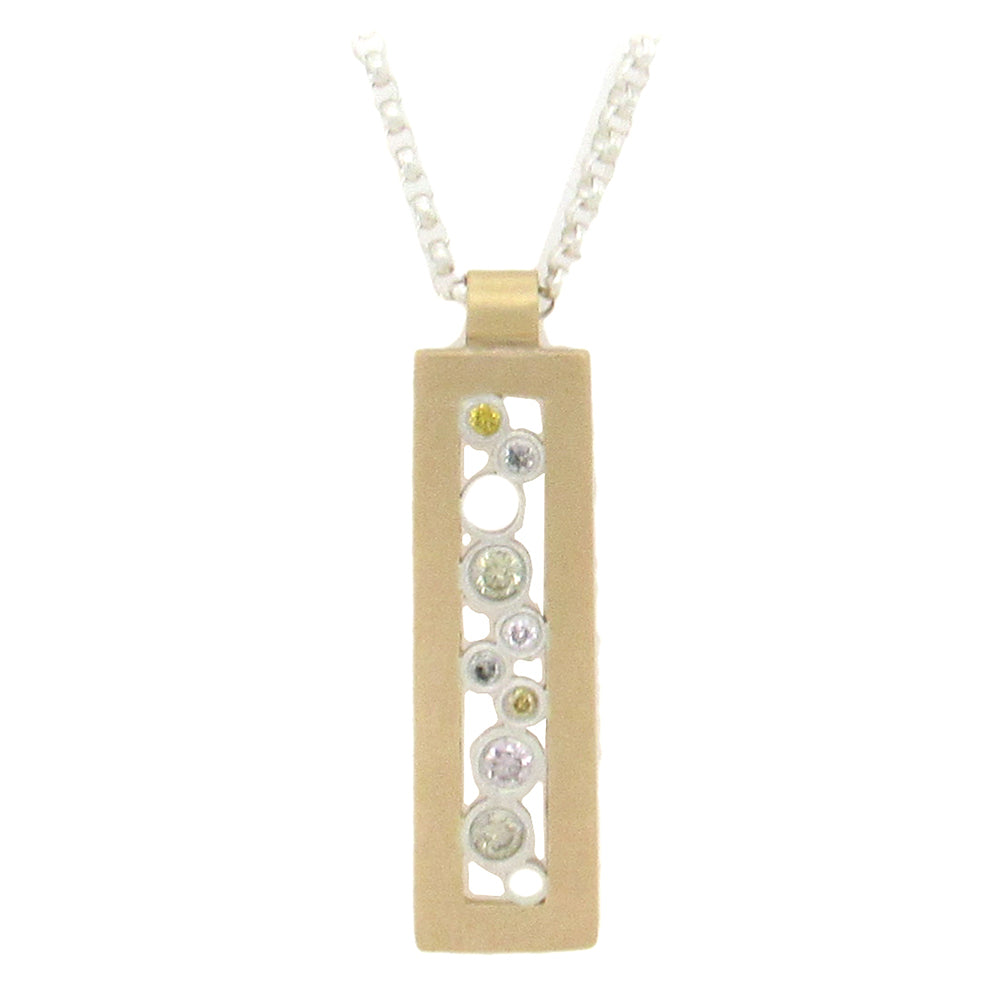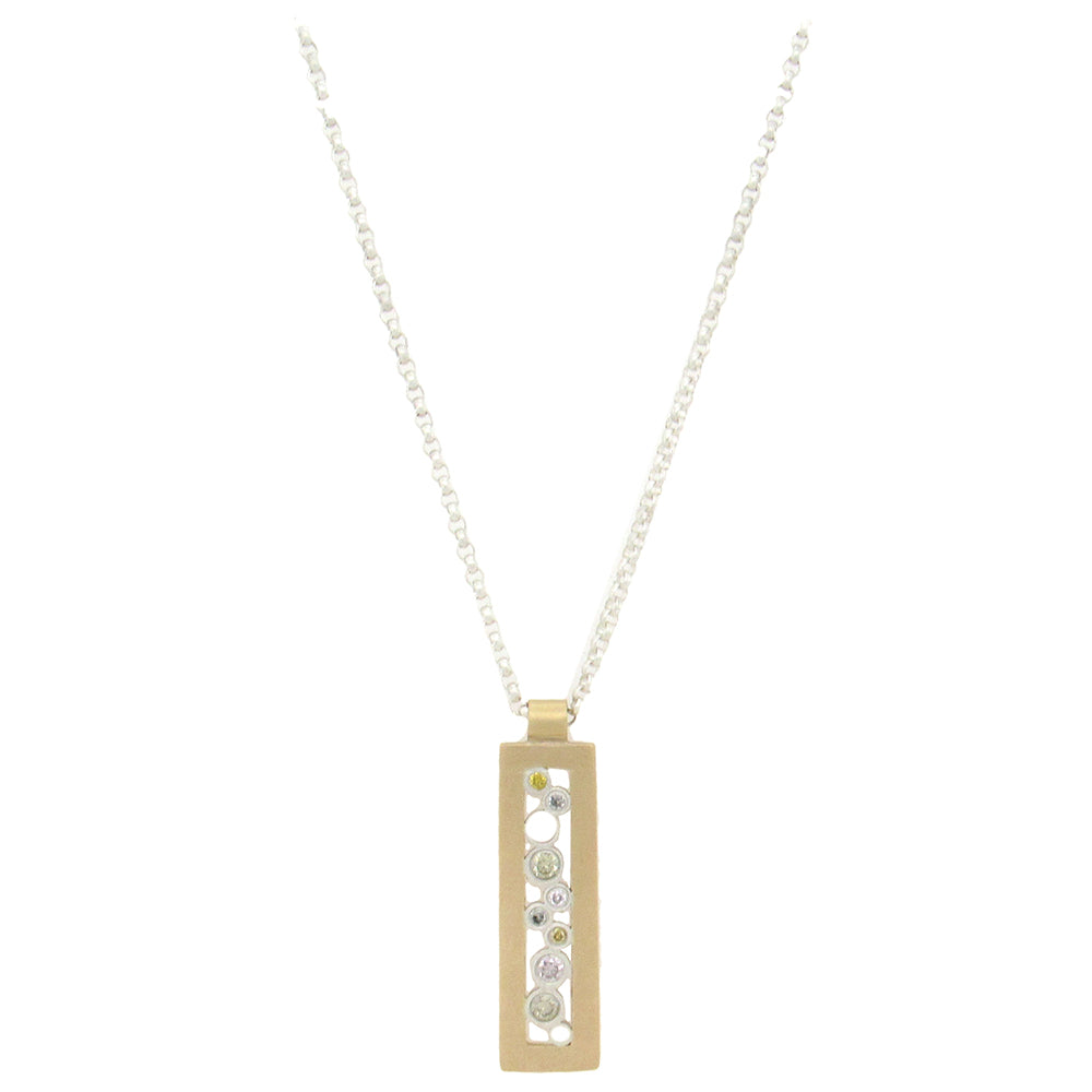 Belle Brooke's 18K yellow gold and sterling silver rectangular 'Sol' pendant is set with 0.06 cts diamonds, on an adjustable sterling silver chain, 16"-18" long, the pendant measures 1/4" x 1".