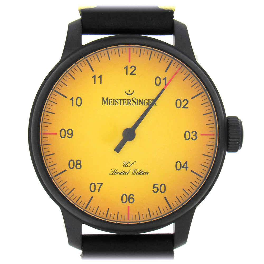Meistersinger's single hand black Limited Edition USA wristwatch, 43mm in DLC stainless steel with a ombre yellow dial, is a self-winding classically designed wristwatch with see-through back traced with the map of the United States in black, yellow dial with painted Arabic numerals, blackened steel hour hand, see through back with 26 jewel Swiss made automatic movement warrantied by the manufacturer for 2 years, accompanied by box and papers. This US Edition is number 25 out of 50.
