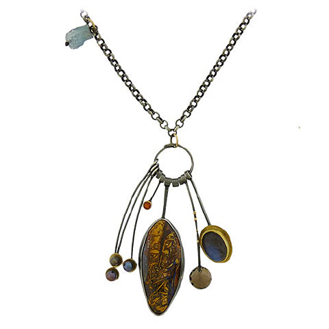Sydney Lynch's 'Canyon' cluster necklace is inspired by the desert palette in shades of autumn. It is anchored by an Australian Koroit opal, flashes of blue gleaming through the patterned cream-and brown gem. The curving tendrils of sterling silver, black dyed pearls at the end, an oval labradorite set in 22K gold, with accenting orange spessartite garnet, rough aquamarine and a smoky quartz briolette. The oxidized sterling necklace is 24" long, with additional 3" pendants drop.