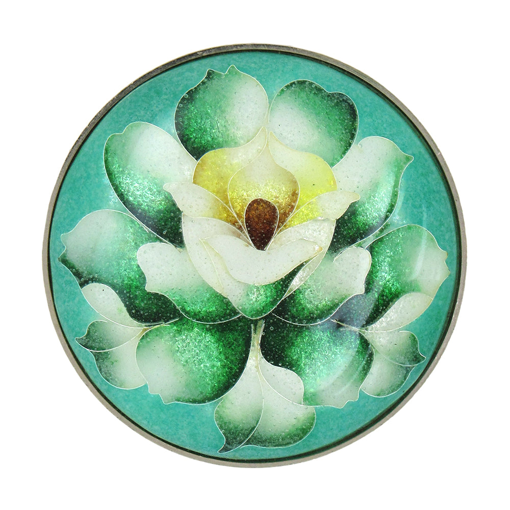Vintage cloisonne enamel green, cream and yellow flower brooch and pendant is beautifully made with layers of depth and transparency depicting the many layers of petals. The brooch pendant is 1-1/2" diameter, set in rhodium white metal.