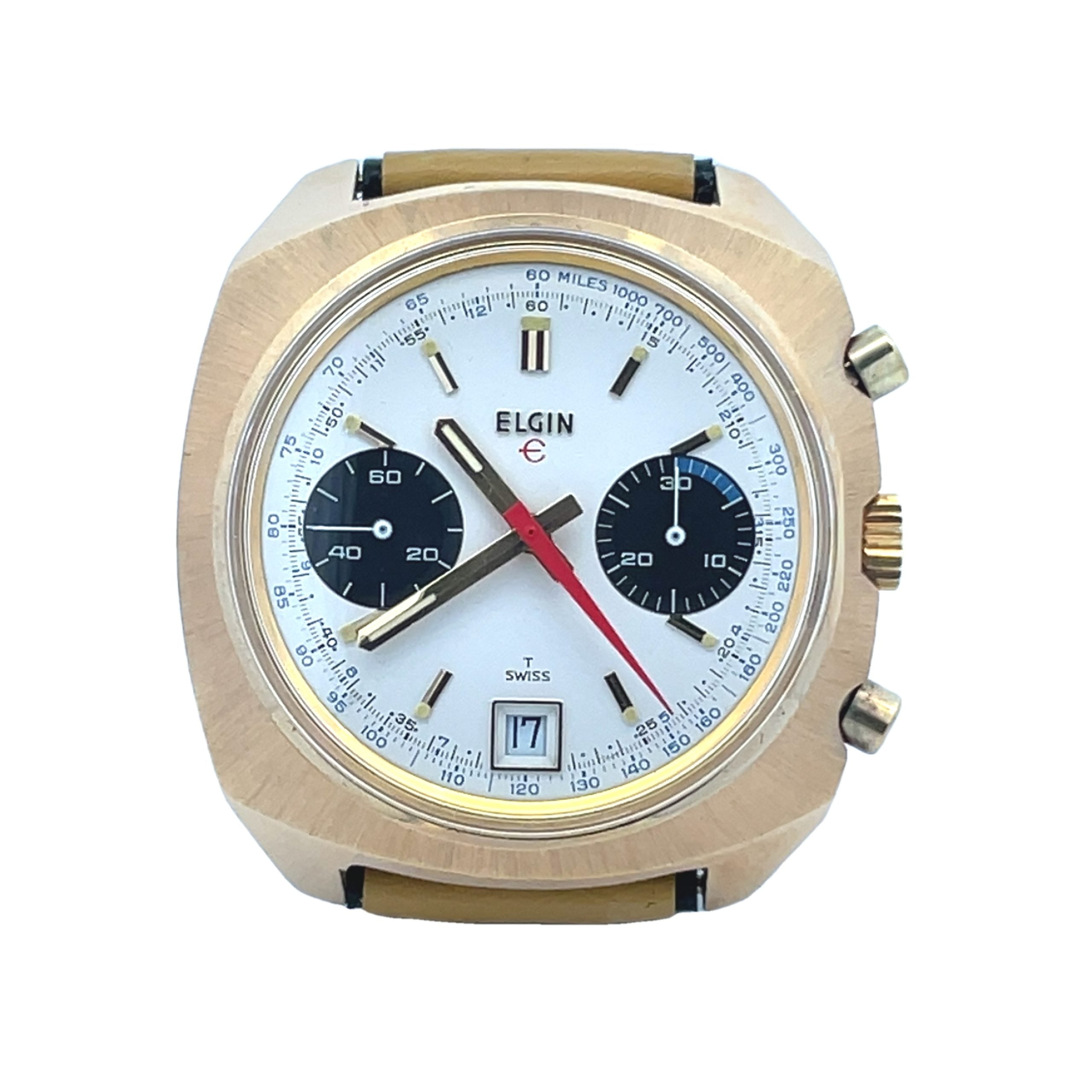 Rare collector's find: NOS Elgin panda chronograph from the 1970's with its iconic cushion-form case, matte and polished gold plated top and steel screw-down back, measures 39mm x 42mm. The matte silvered dial features black seconds and 30 minutes registers, outer blue tachymeter register, red chrono hand, date window at 6. Original Elgin stamped strap made in France, box, outer box, booklets, tags. Manual wind Valjoux 7736 movement warrantied by Aaron Faber for 1 year.