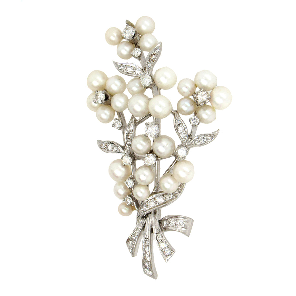 Diamond and cultured pearl brooch, circa 1980's, is set with white pearls ranging in size from 3mm to 5mm, in a charming ribbon-tied bouquet design, in 14K white gold. the brooch measures 1-1/2" x 2-3/8".