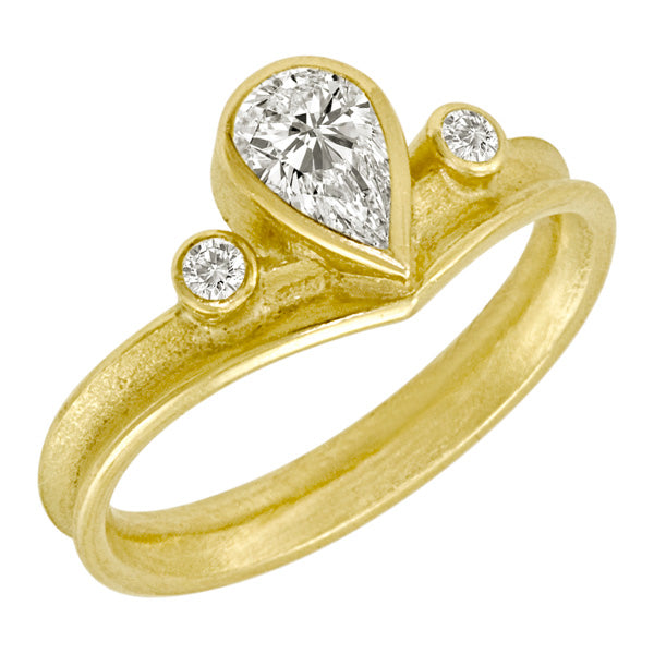 Barbara Heinrich sets a 0.55 carat pear shape diamond (H color,VS1 clarity) in her distinctive matte-finished handmade gold grooved V-shape band,with two side brilliants 0.09 cts.