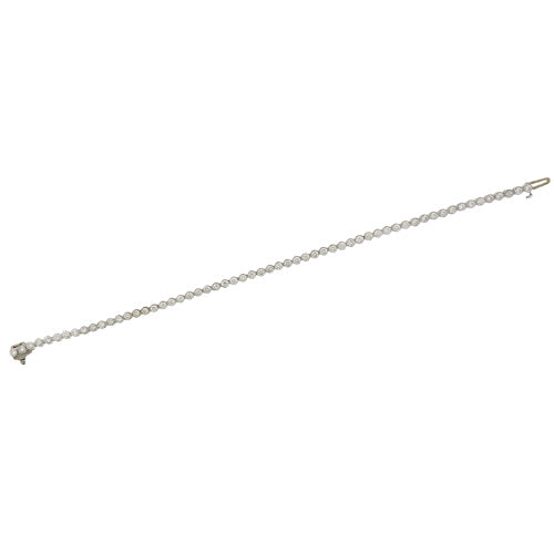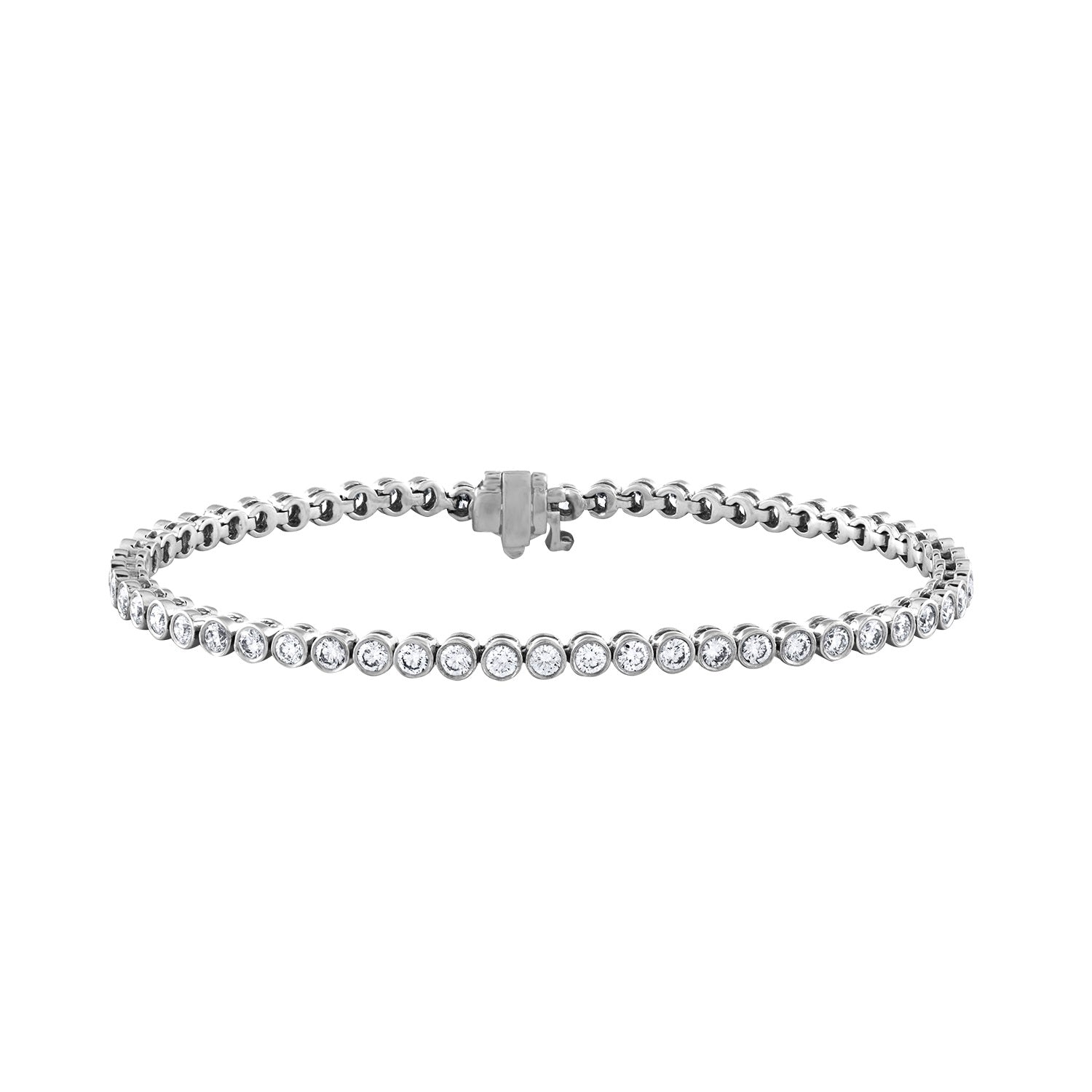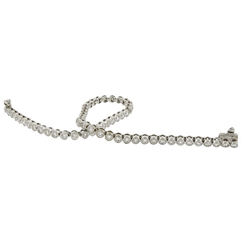 Classic diamond line bracelet, 2.75 carats total weight, each diamond set individually in a round bezel, captures the glitter and romance of diamonds in a well-designed, well-made version that can be worn solo, with other bracelets or a watch, or in pairs. 7" long, set in 18K white gold.