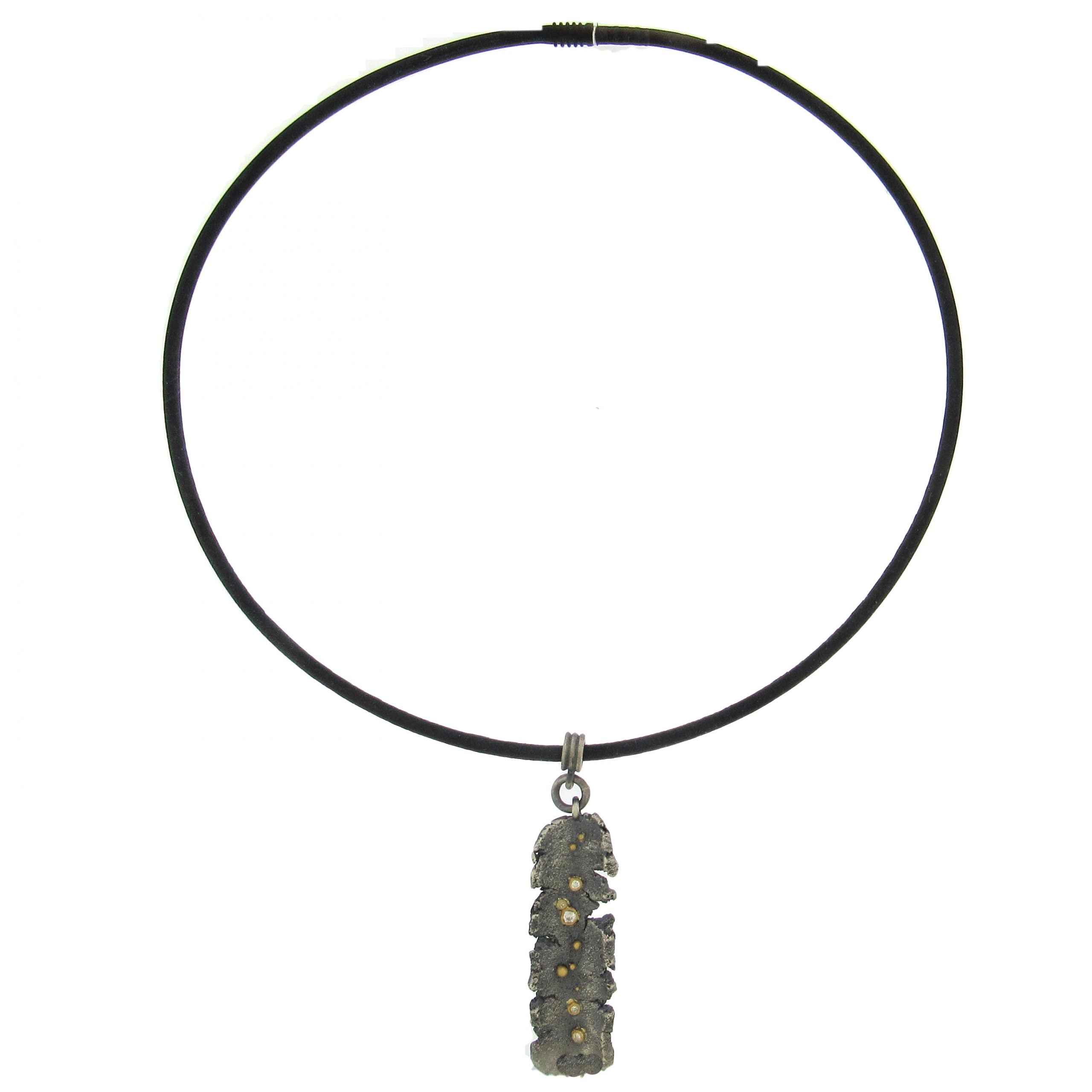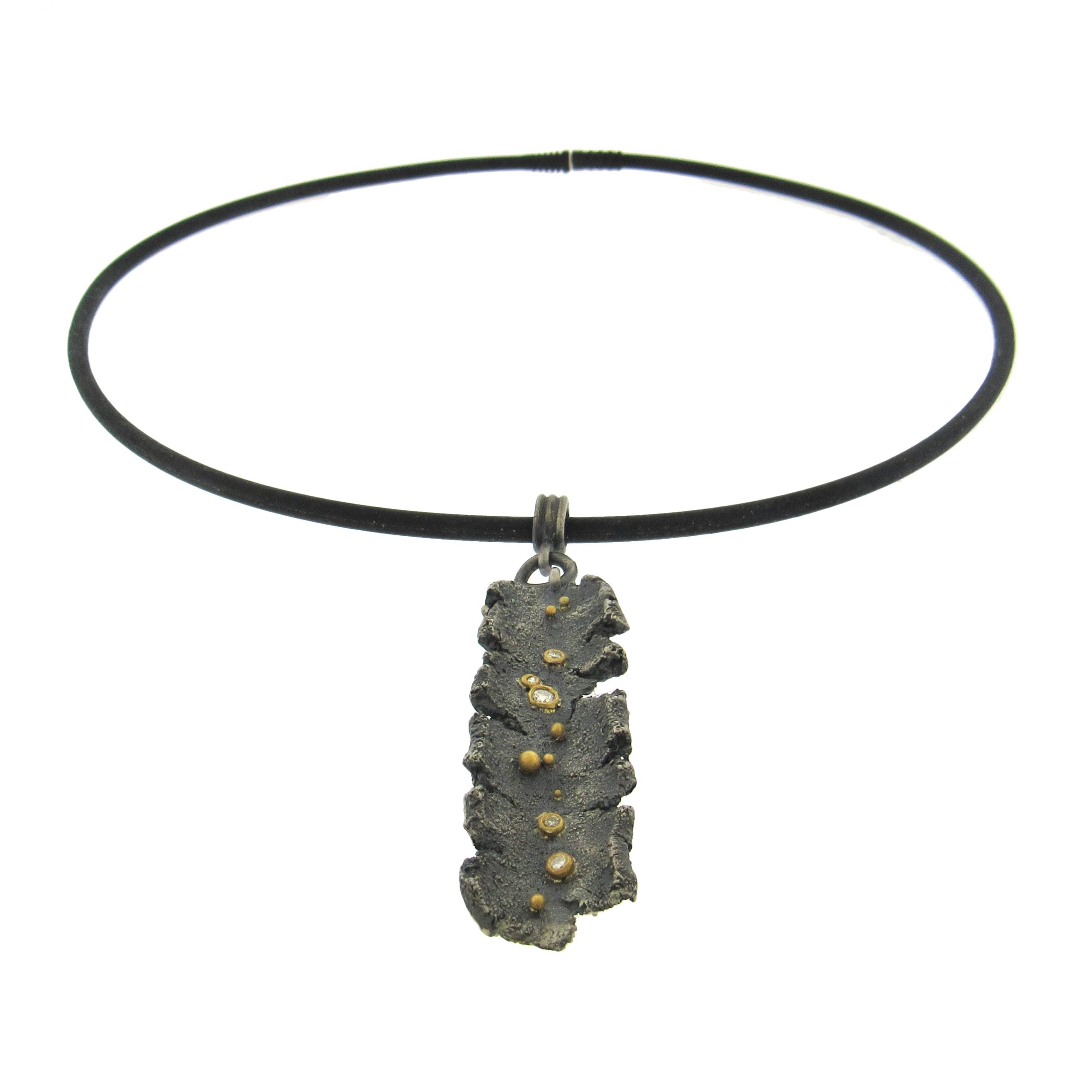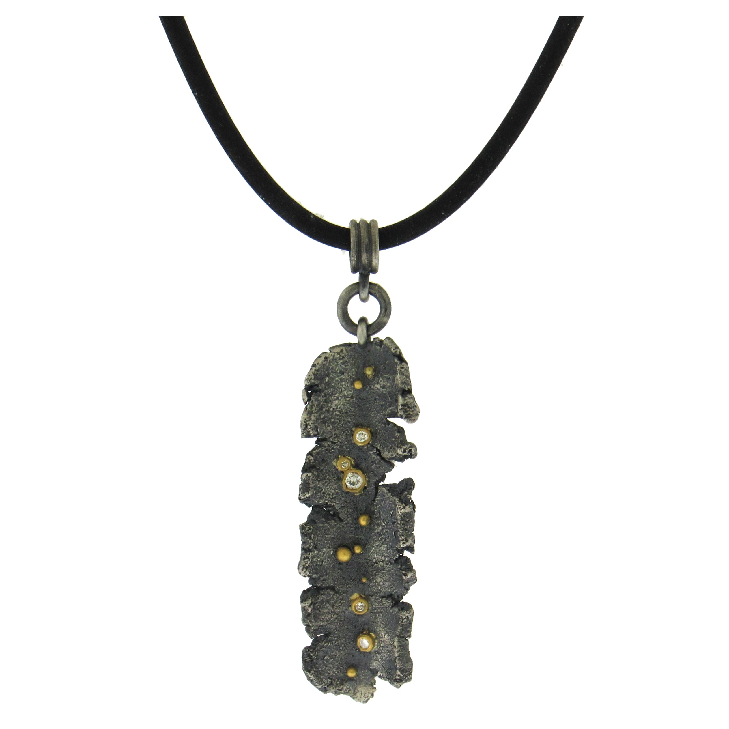 Sterling silver diamond pendant by Michael Jensen, the distressed oxidized silver with 22K granulation and 0.18ct tw diamonds. The pendant measures 5/8" x 2-5/8",on a tension closing rubber cord, 16-1/2".