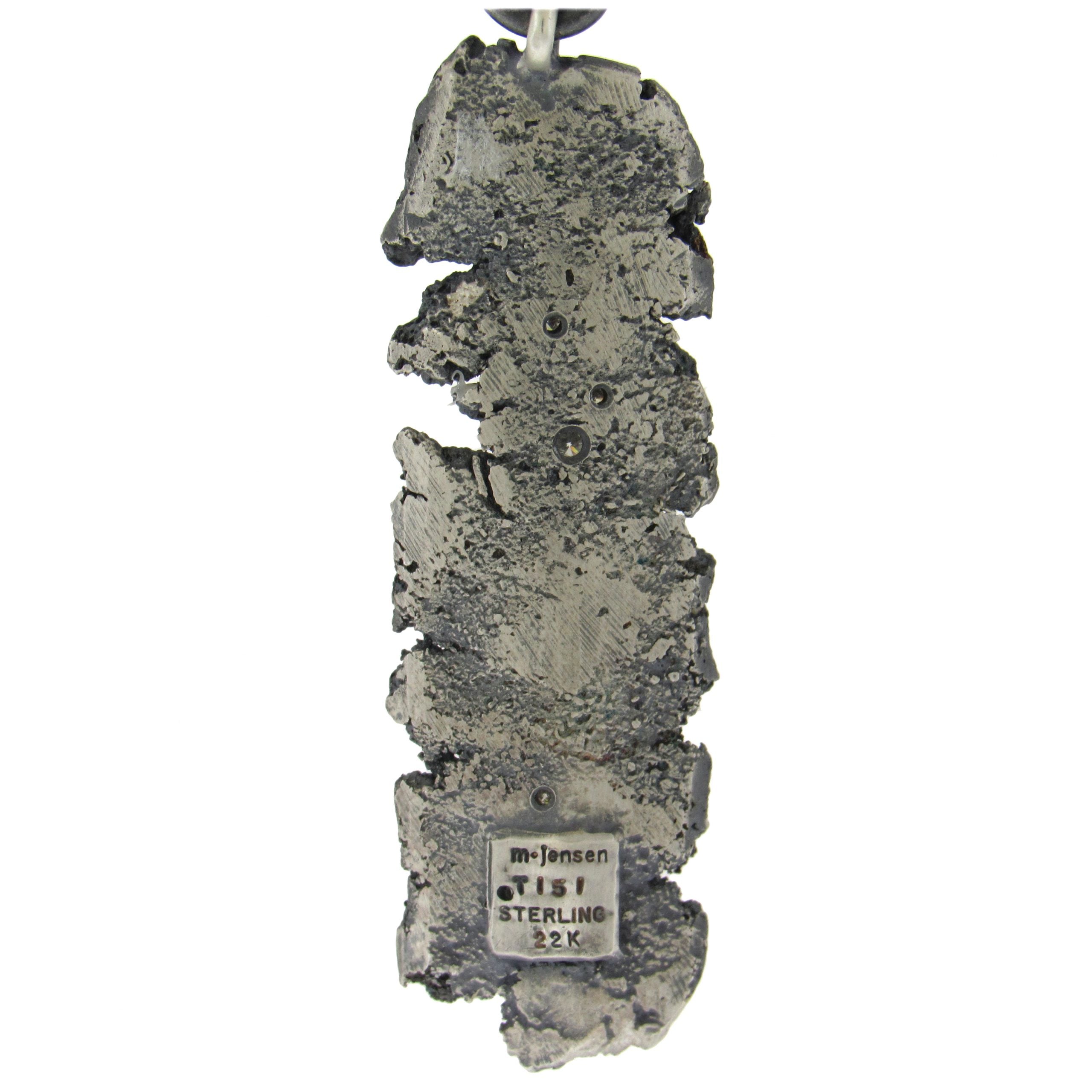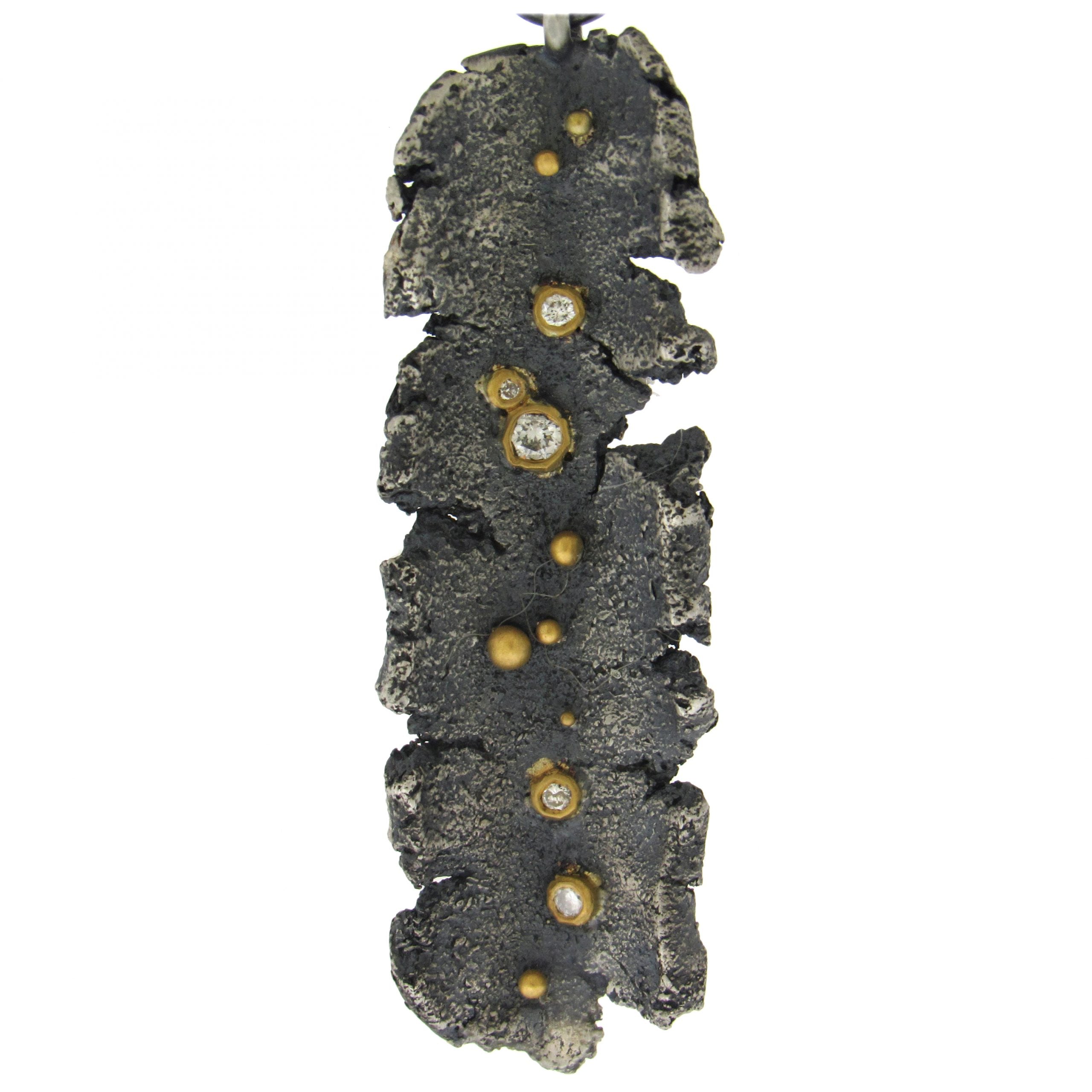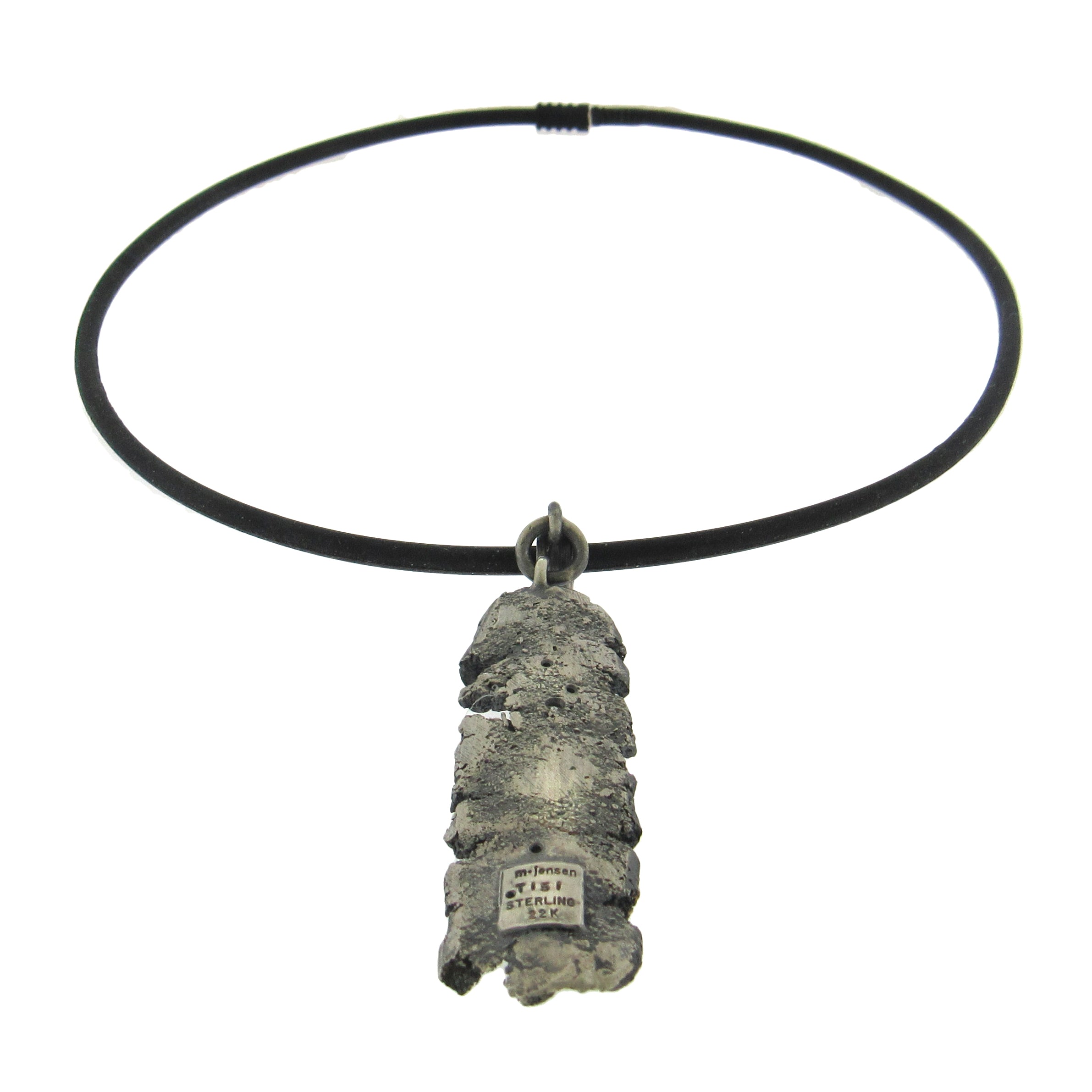 Sterling silver diamond pendant by Michael Jensen, the distressed oxidized silver with 22K granulation and 0.18ct tw diamonds. The pendant measures 5/8" x 2-5/8",on a tension closing rubber cord, 16-1/2".