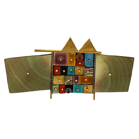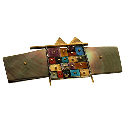 Earl Pardon (1926-1991) was trained as painter and brought his understanding and love of color to the jewelry for which he is famous. This brooch combines a center square collage of brilliant enamel squares, blue topaz, rhodolite garnet and 14K gold, flanked by two squares of iridescent abalone shell. The brooch measures 3" x 1-3/8".