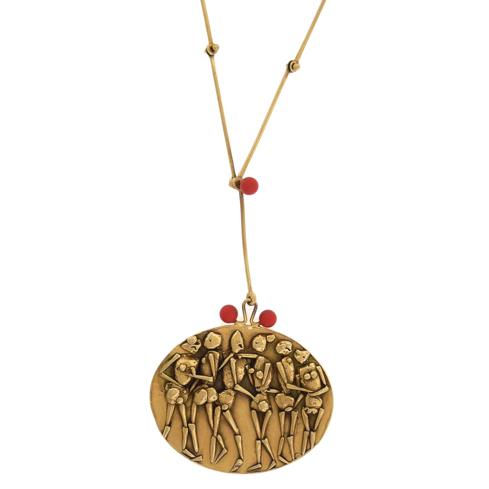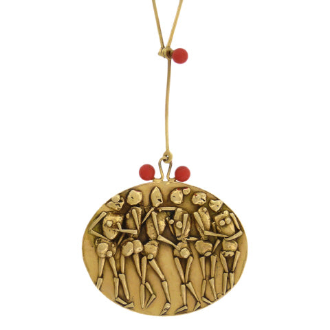 Earl Pardon, modernist jewelry artist, created a series of 'people' pendants, circa 1970's and 1980's, and this is one from that period. The oval pendant, 1-5/8' x 1-3/8", is a frieze of intriguing figures in pairs, with coral beads at top. The 14K handmade wire necklace is 16-1/2" long. Pardon hallmark tag near clasp.