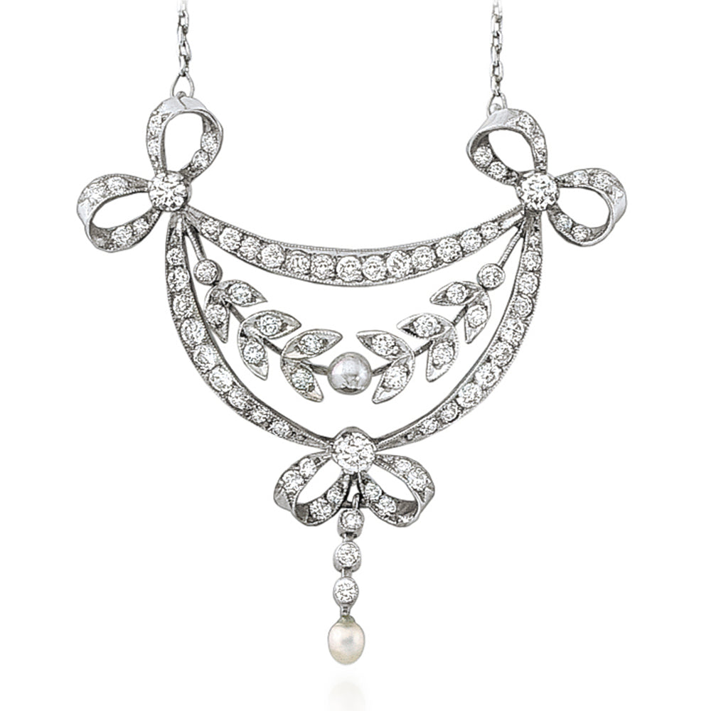 Graceful Edwardian diamond and pearl lavaliere pendant in filigree platinum is a signature example of the Edwardian style: lacy bowers, wreaths and bows executed by European master jewelers for the courts of France and England in the fashionably new platinum of the period, ca. 1880. 18" 18K white gold chain aded later, total length 19.5"