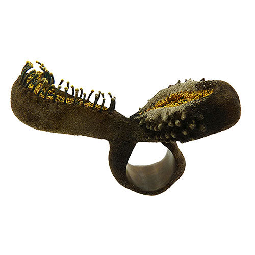 Arata Fuchi's Eel ring and sculpture divides its two forms across the hand,formed in oxidized sterling silver,pure silver,pure gold and shibuichi. Shibuichi is an alloy of copper and silver used traditionally in Japanese sword-making,but here alloyed by Fuchi to create the armature of the eel,its open curves inset with sterling bristles,pure silver powder,pure gold granules,in a fantastical sculpture. The ring measures 3" x 1" x 1-1/4".