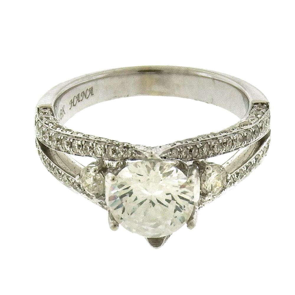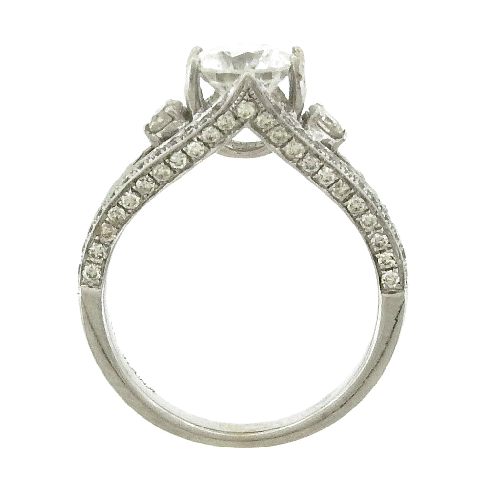 18K white gold diamond semi-mounting is set with 0.82 carats diamonds in a split-shank mounting to bring the eye to the center gem. Suitable for 1.25-1.75 carat diamond.
