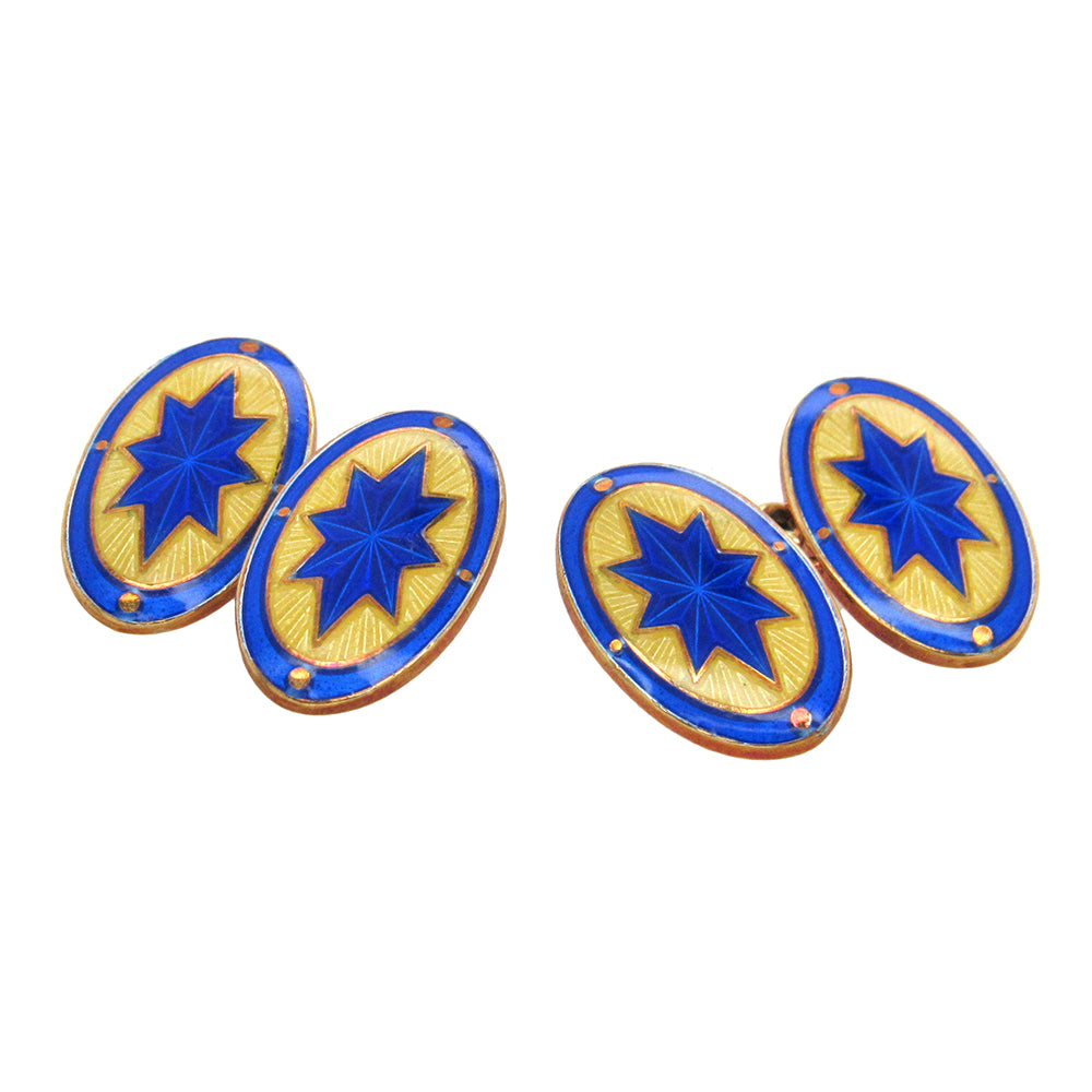 9K gold cobalt blue and citron yellow starburst guilloche enamel double-sided ovals, these estate cufflinks measure 3/8" x 3/4", dated 1998, hallmarked.
