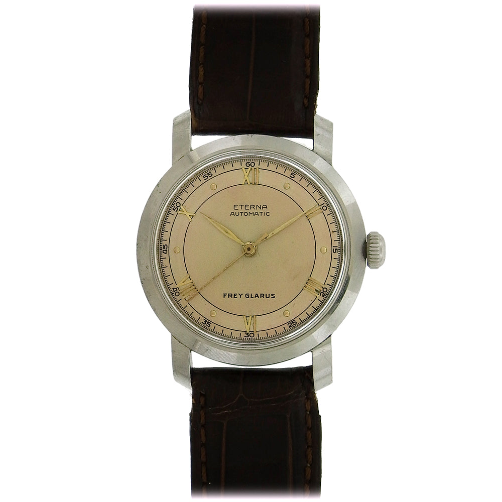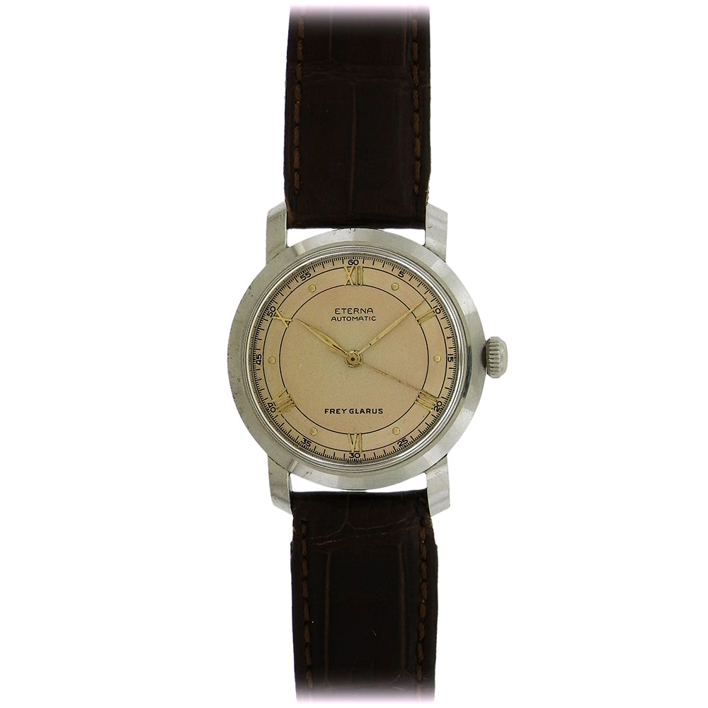 Stainless steel Eterna automatic,retailed by Frey,Glarus circa 1950,is a center seconds,self-winding,water-resistant,anti-magnetic,stainless steel wristwatch with two-tone copper dial. The 33mm case has a screw-down back,flared leaf-shape lugs,inclined bezel,two-tone copper dial with center seconds,applied yellow gold Roman numerals and dot indexes,outer minute/seconds reserve,gold leaf hands. The automatic 18 jewel movement is warrantied by Aaron Faber for 12 months.