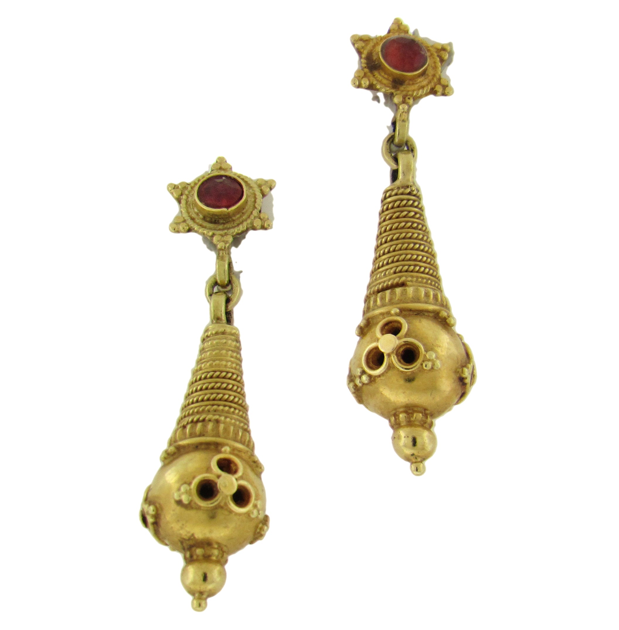 Classic Etruscan design earrings in their signature amphora shape in gold filigree, with later added post tops in a star shape set with rubies. The earrings measure 1/4" x 1-1/4" long.