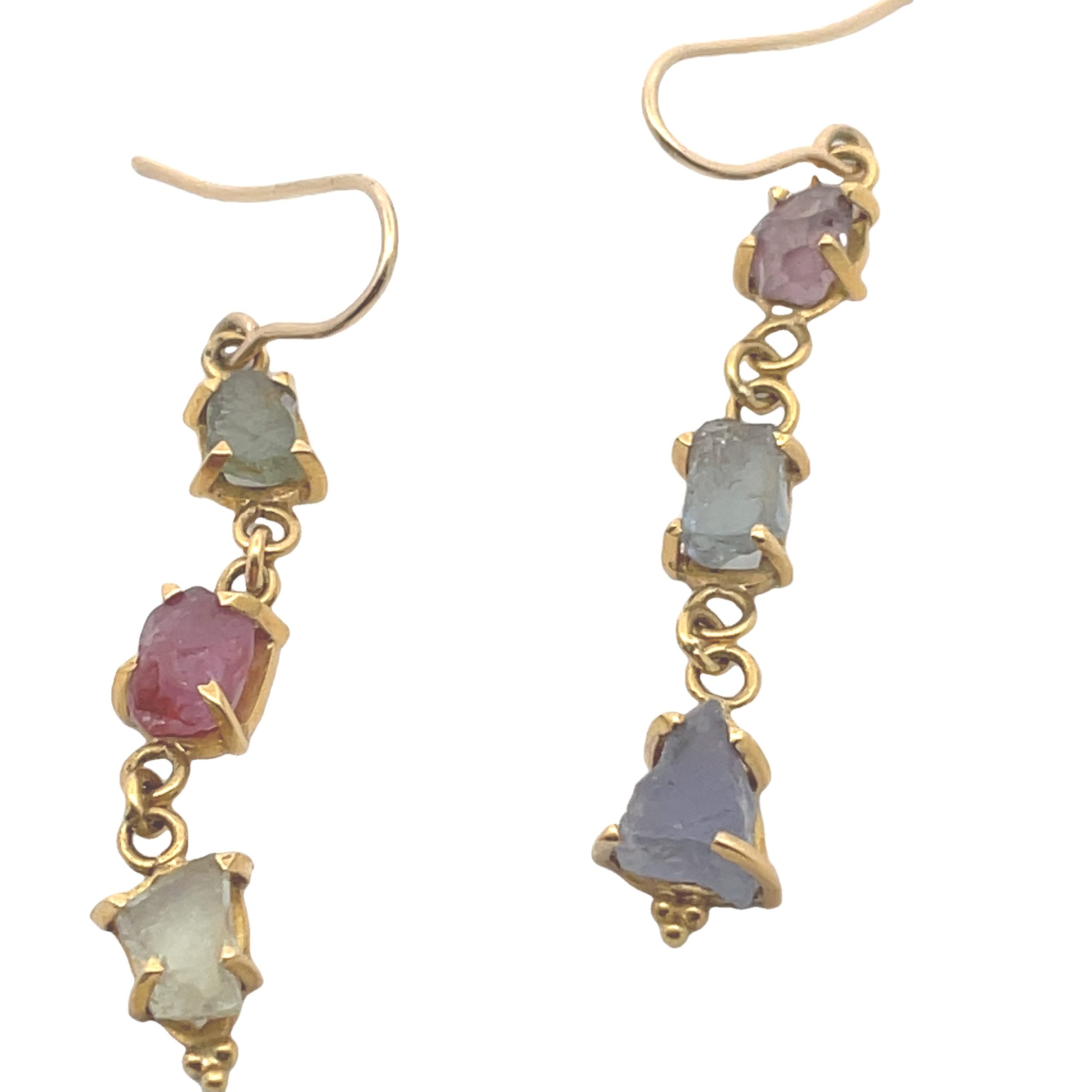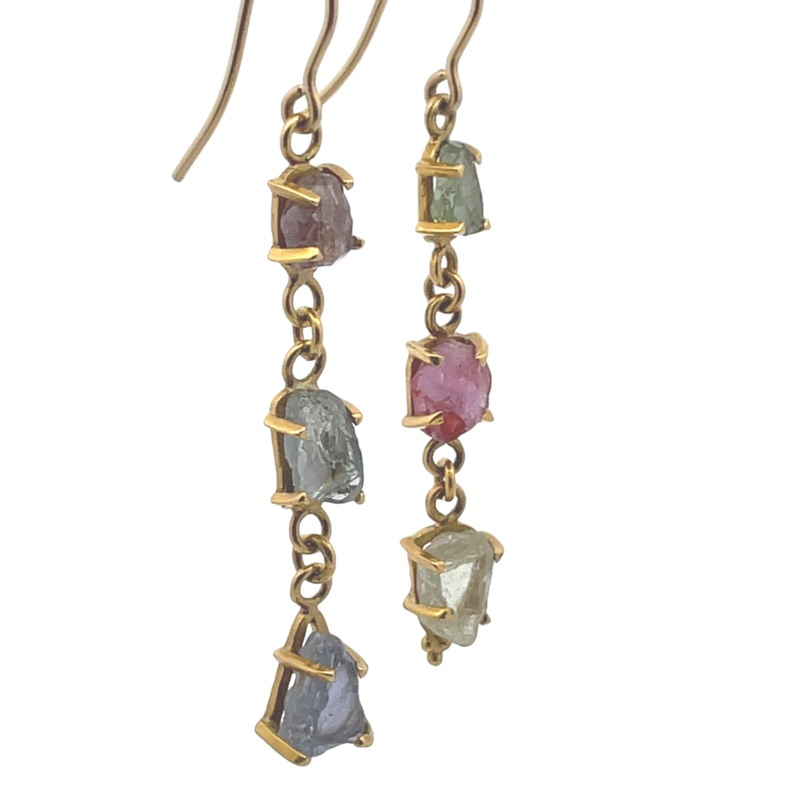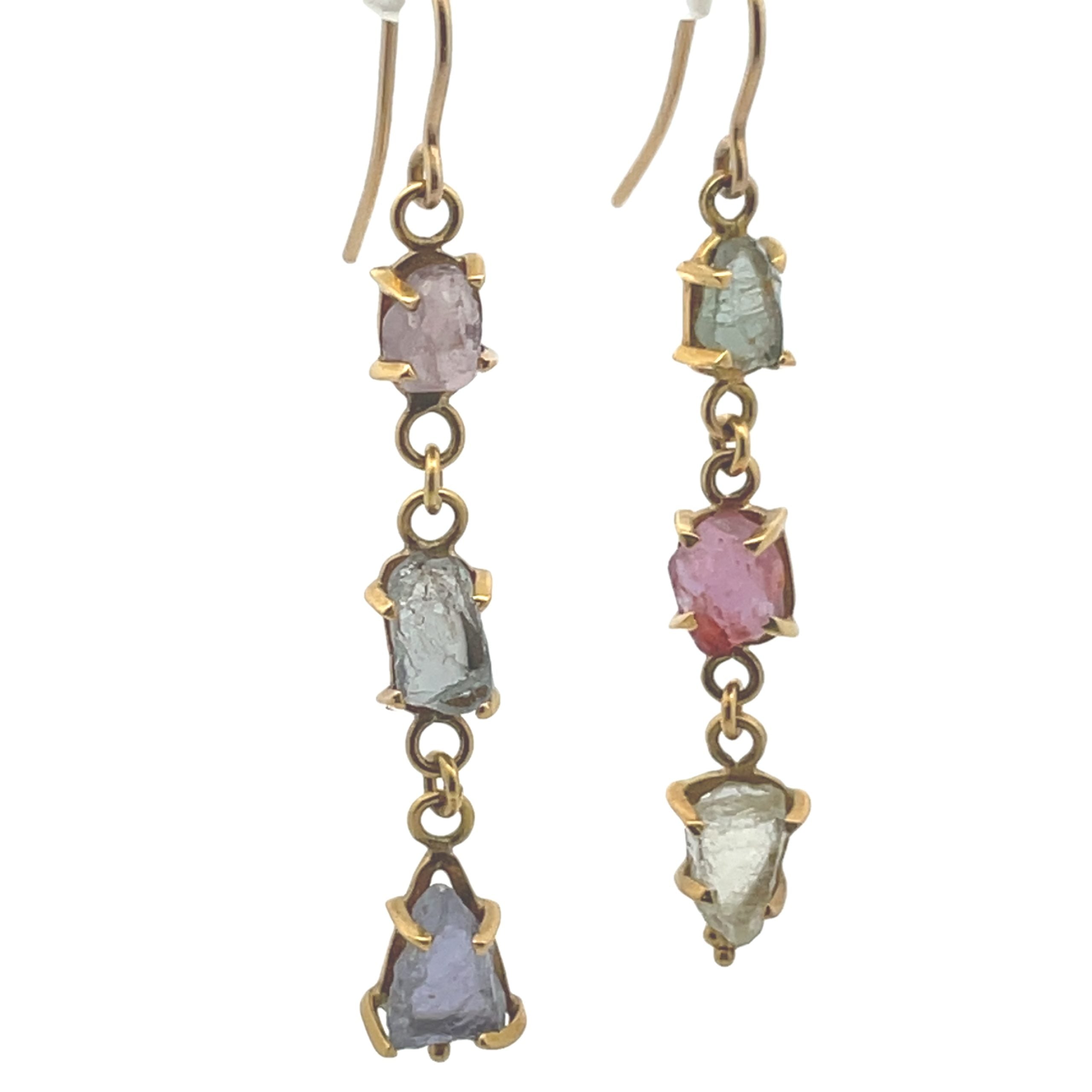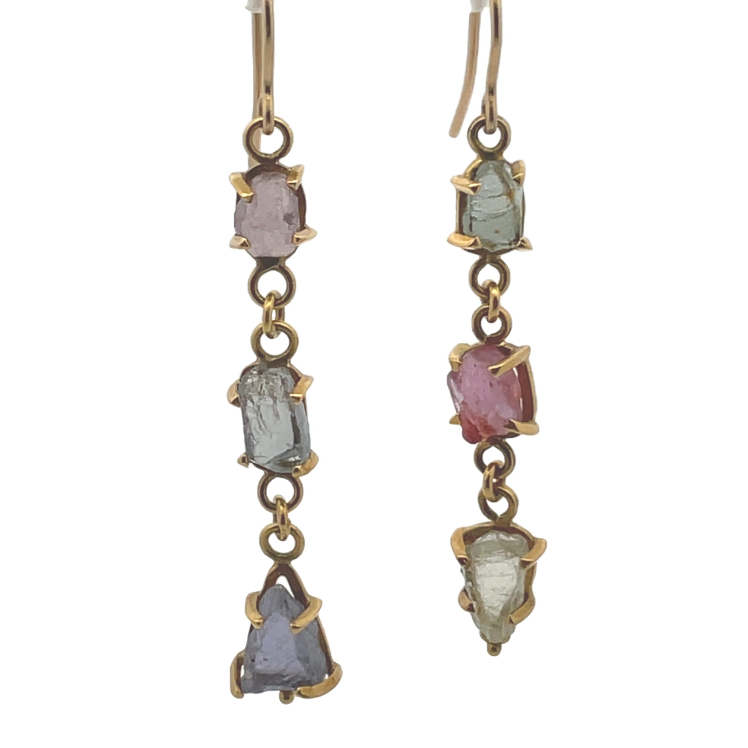 Fancy uncut sapphire crystals in shades of blue, gray, rose and violet are set in Frederika Kulicke's asymmetrical drop earrings set in 18K gold. The earrings measure 1/4" x 2" long.