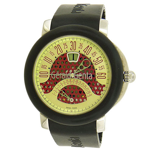 Stainless steel Gérald Genta Arena BiRetro, Ref. BSP.Y.10, circa 2004, is a center seconds, self-winding, water-resistant, jump hour stainless steel wristwatch with retrograde minutes, retrograde date and a stainless steel Gérald Genta deployant clasp. The 45mm case has curved lug, fluted band, case back with 6 screws, protected ball-shaped winding crown edged with dots, sapphire crystal, corrector on the band, and black rubber bezel and strap. The bi-color red and silver dial features large red Arabic numerals for the retrograde minutes sector, aperture for the jump-hour at 12, sector for the retrograde date at 6, outer 1/5th seconds track quarter Arabic markers, and steel skeleton hand. The movement is caliber GG7723, 27 jewels, automatic, warrantied by Aaron Faber for 1 year.