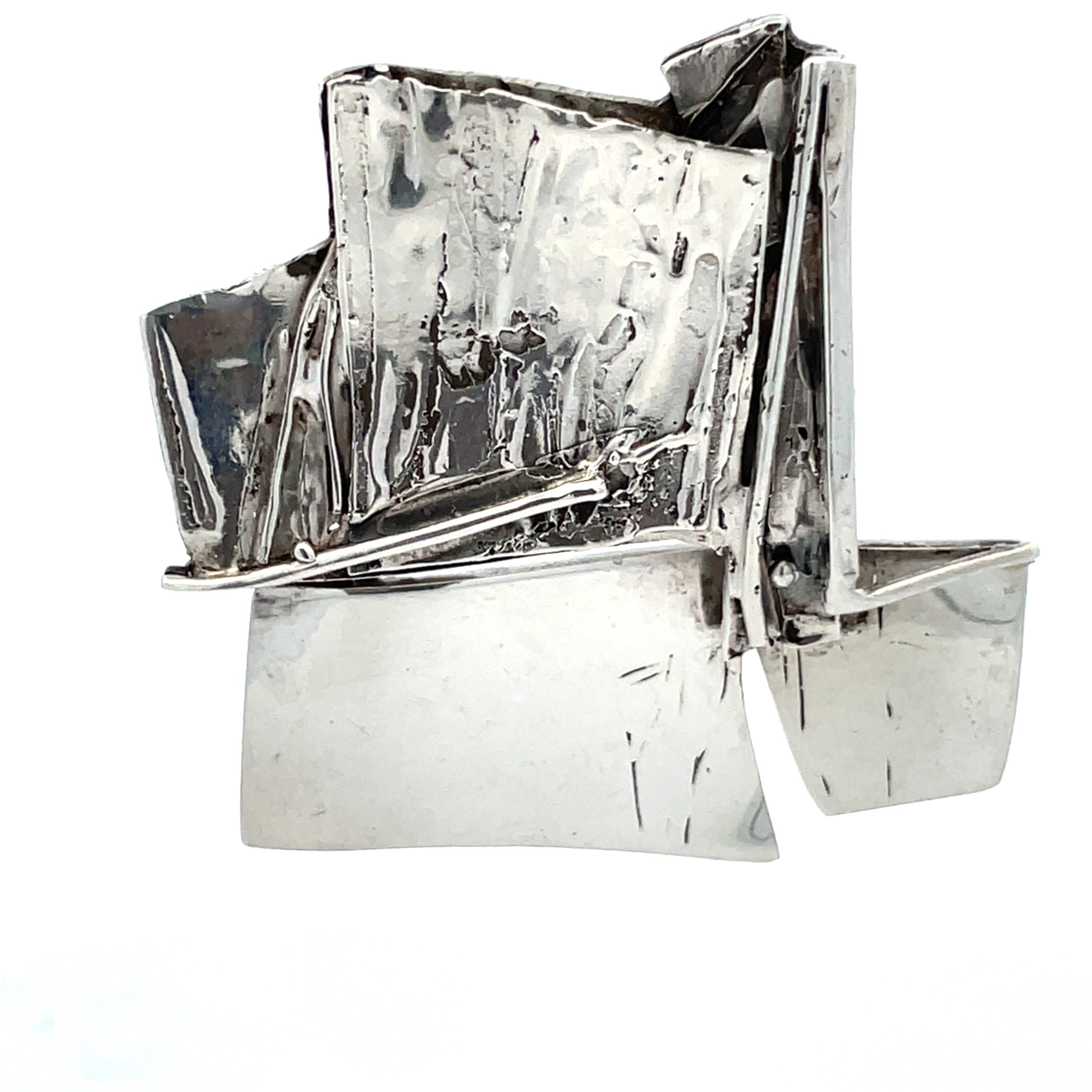 Intriguing sterling silver sculptured brooch circa 1990, balances polished sheets of sterling silver at bottom with upper textured squares distressed and oxidized, one-of-a-kind pin by metal artist Glenda Arentzen from a private estate. The brooch measures 2" w overall x 2-1/4".