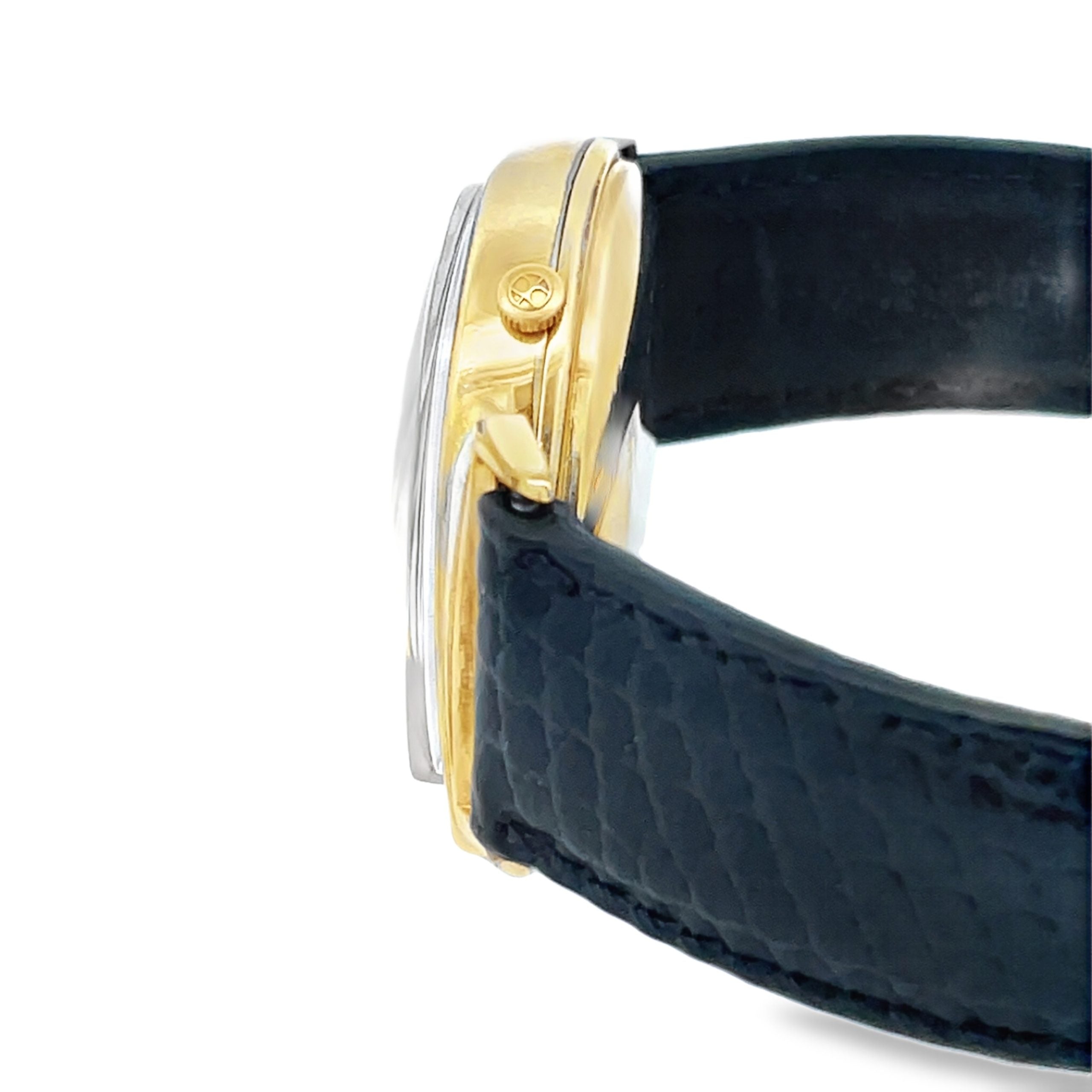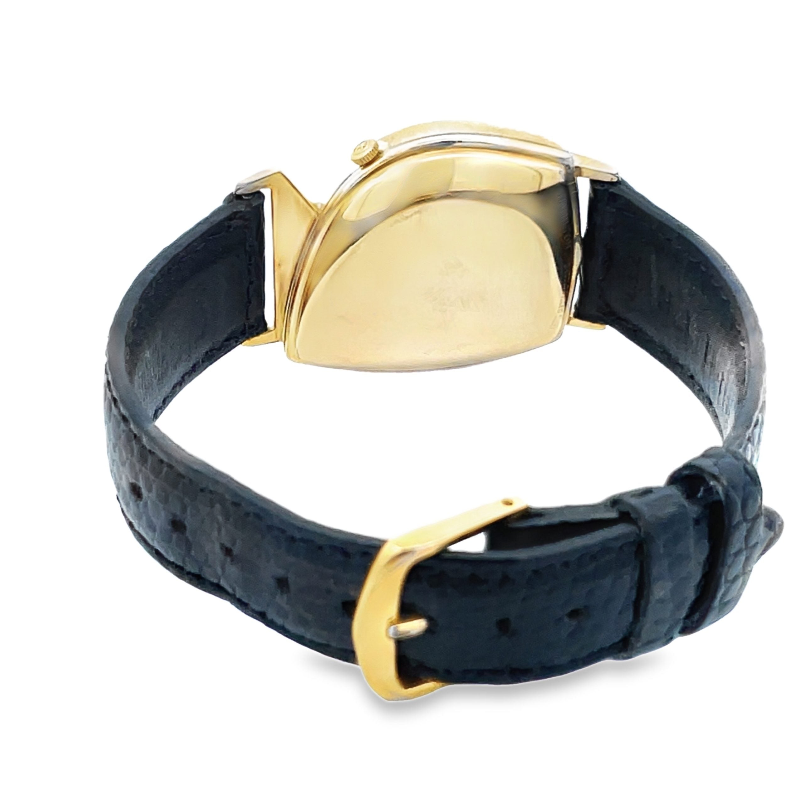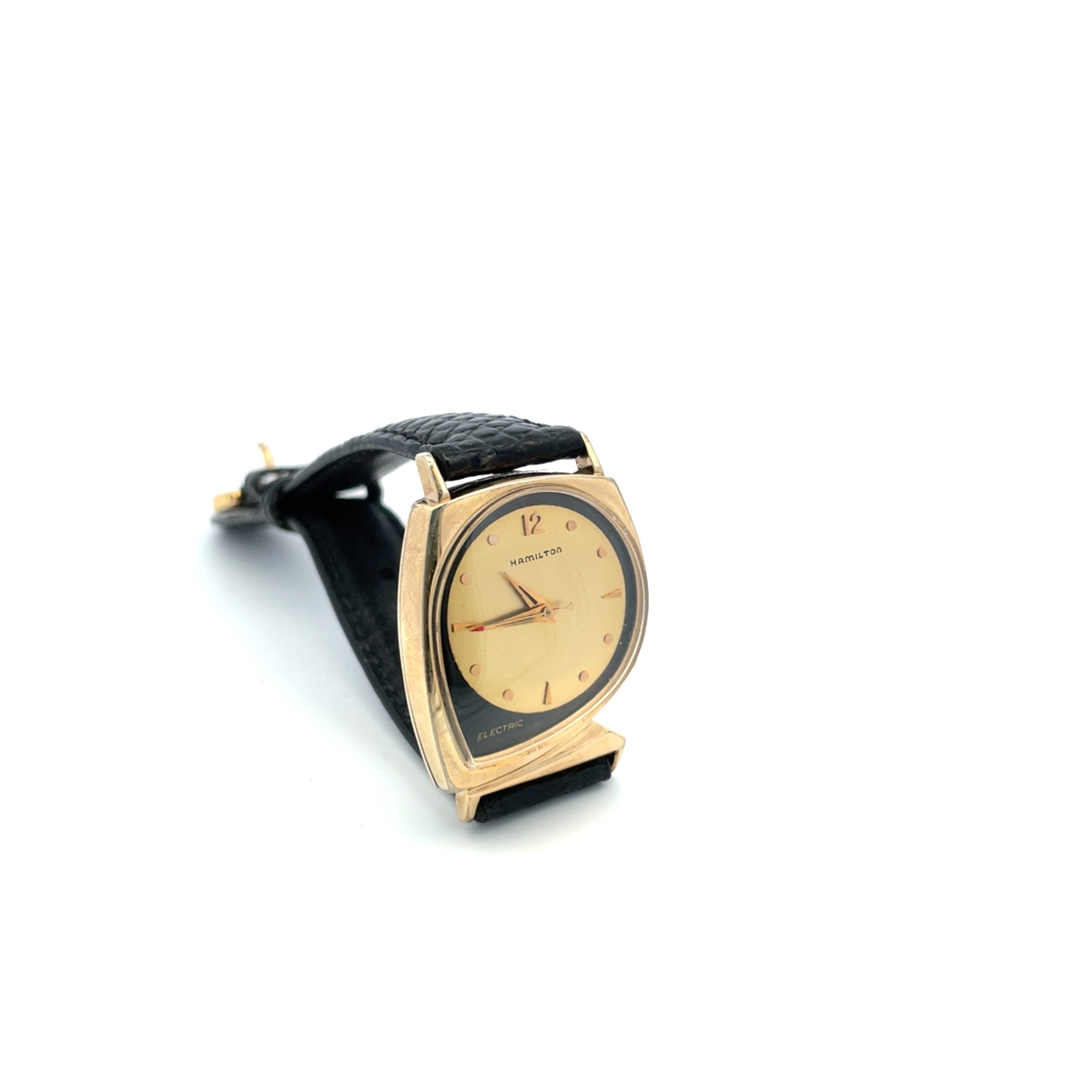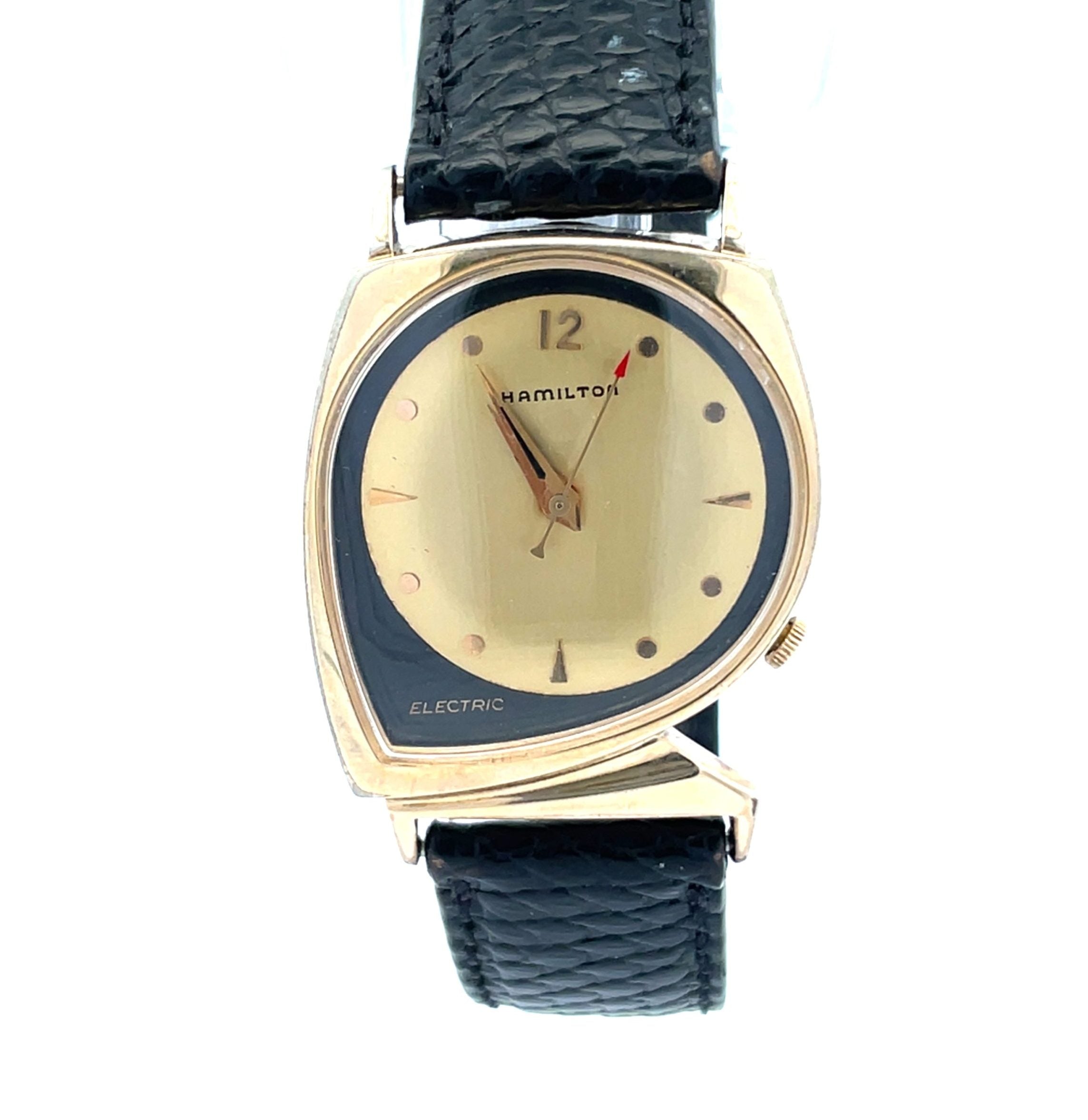 The Hamilton Electric Meteor is a fabulous design, circa 1962, from designer Richard Arbib, and this Meteor is one of only 3000 made by Hamilton, of which only 1500 have the sought-after black and gold dial. It is a 10K yellow gold-filled asymmetric case, measuring 29mm across and 40mm, lug to lug end, with 10K Hamilton buckle. The movement is the famous Hamilton 505 movement, mechanical with battery power. The futuristic Hamilton asymmetrics are the most collectible of the mid-century American watches. In good condition, warrantied for 1 year.