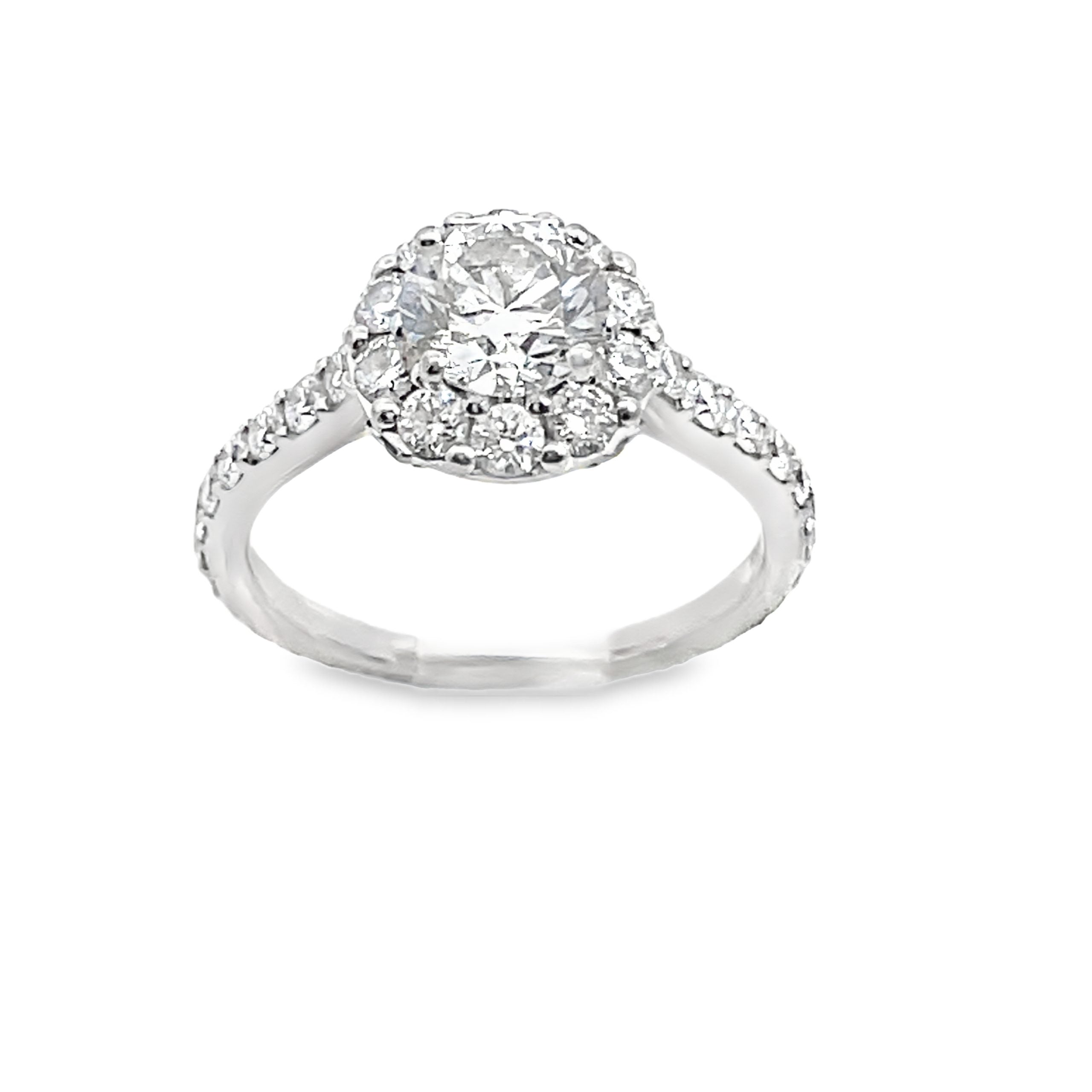 Diamond engagement ring from Graff, previously owned, is set with an 0.83 ct. center round brilliant diamond, graded by Graff G/VS1, set in 18K white gold, with a halo and shank set with 57 diamonds, tw, 1.73 cts. Accompanied by original box, Graff certificate, receipt and paperwork. The ring is currently size 5, and can be sized. *original purchase 2024 $11000