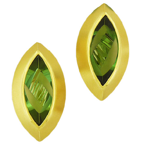 Tom Munsteiner and Jutta Munsteiner collaborate to create fresh designs with Tom's sculptured gems. Here, navette-shape pure green tourmalines, 6.62 carats, are cut with a diagonal ladderback design at back, to intensify and reflect the color, then set in a sloped 18K yellow gold bezel, to complement the gems. 1/2" w x 1-1/8" long, posts and omega backs.