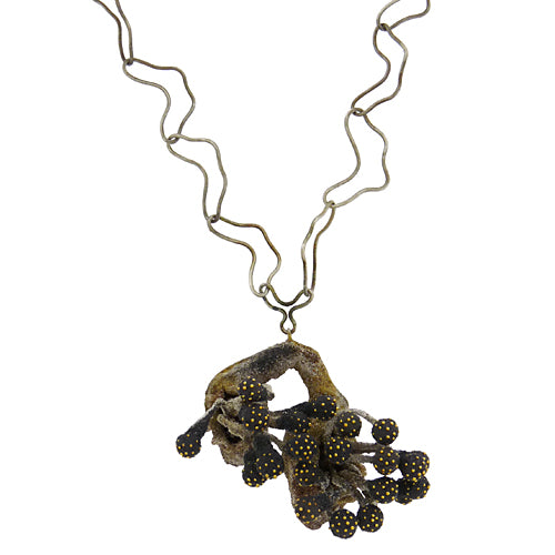 Arata Fuchi's 'Growing Bud' sculpture is an island of fabricated textured silver and oxidized sterling,18K white gold and 24K gold stems,on a bommerang link sterling chain,to be displayed on a tabletop as a sculpture or worn on the 17" chain. 'Growing Bud' dimensions are 1-3/4" w x 1-1/4" l x 1-1/2" h.