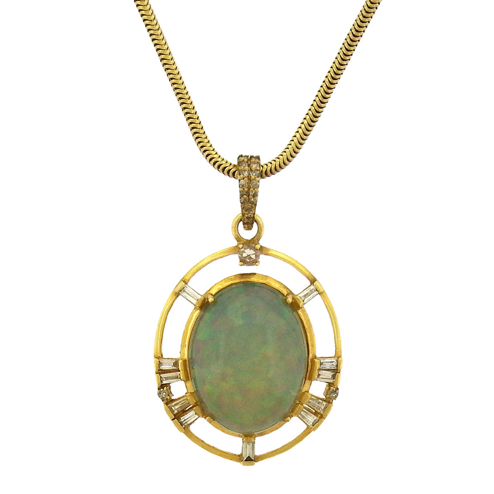 Oval Ethiopian oval cabochon is surrounded with 11 diamond baguettes and framed in 18K gold with diamond pave bale. Measures 7/8" x 1-1/2", snake chain sold separately.
