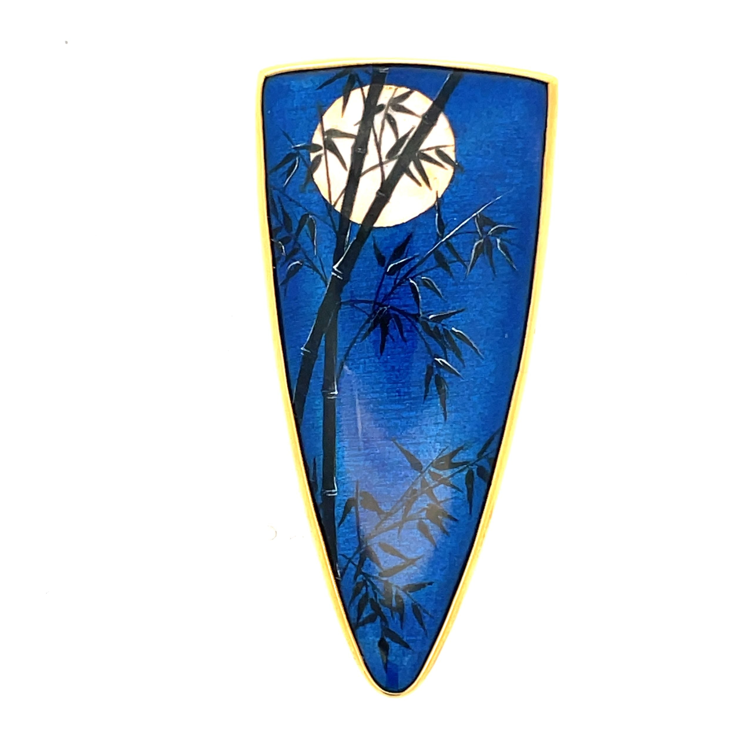Artist Larissa Podgoretz paints in Limoges enamel, layering color after color and kiln-firing each color separately to build up the image we see. "Moonlit Bamboo" captures the light and the mood of the night foreshadowed by delicate bamboo leaves. The brooch and pendant measures 1-1/4" x 2-1/2", set in 22k and 18K golds.