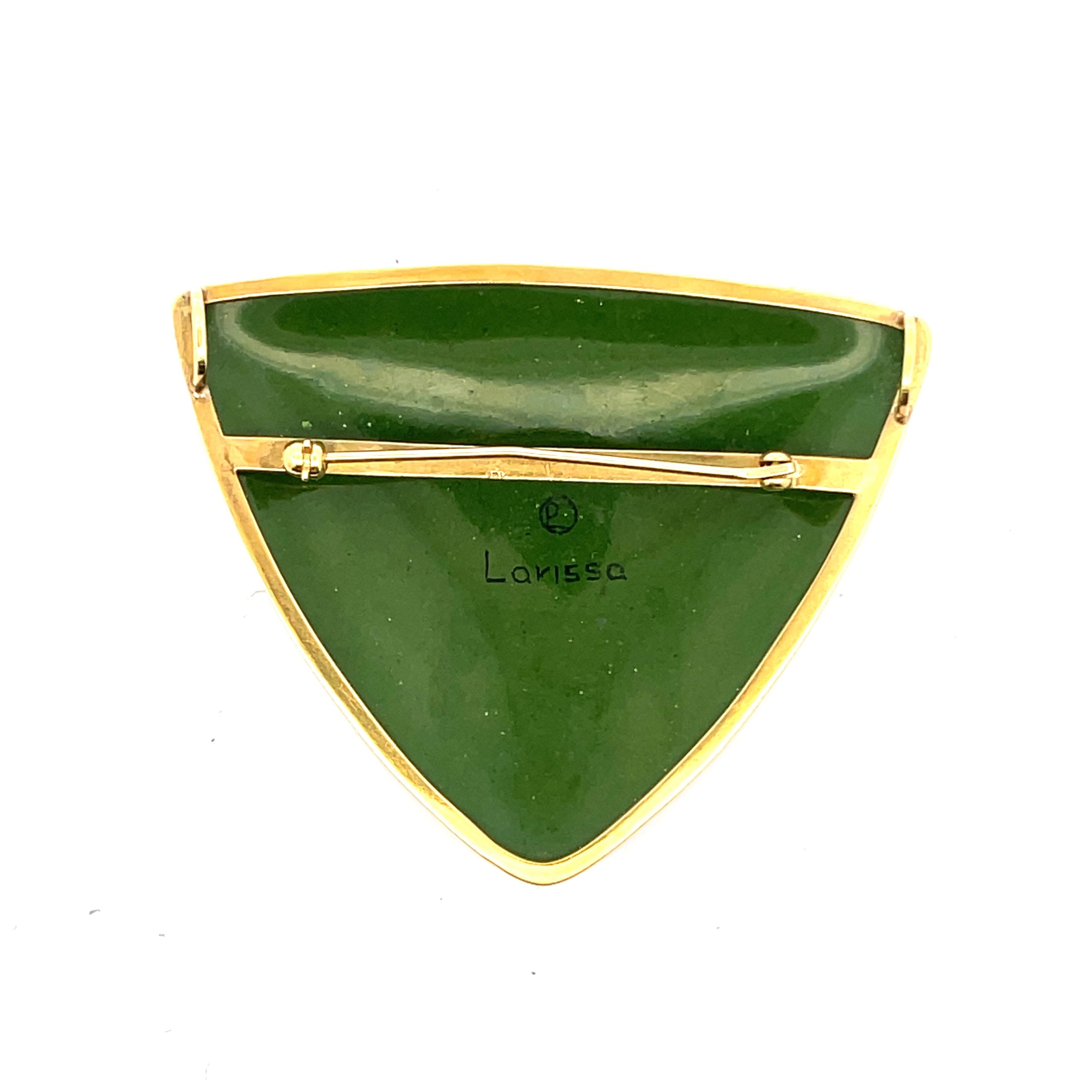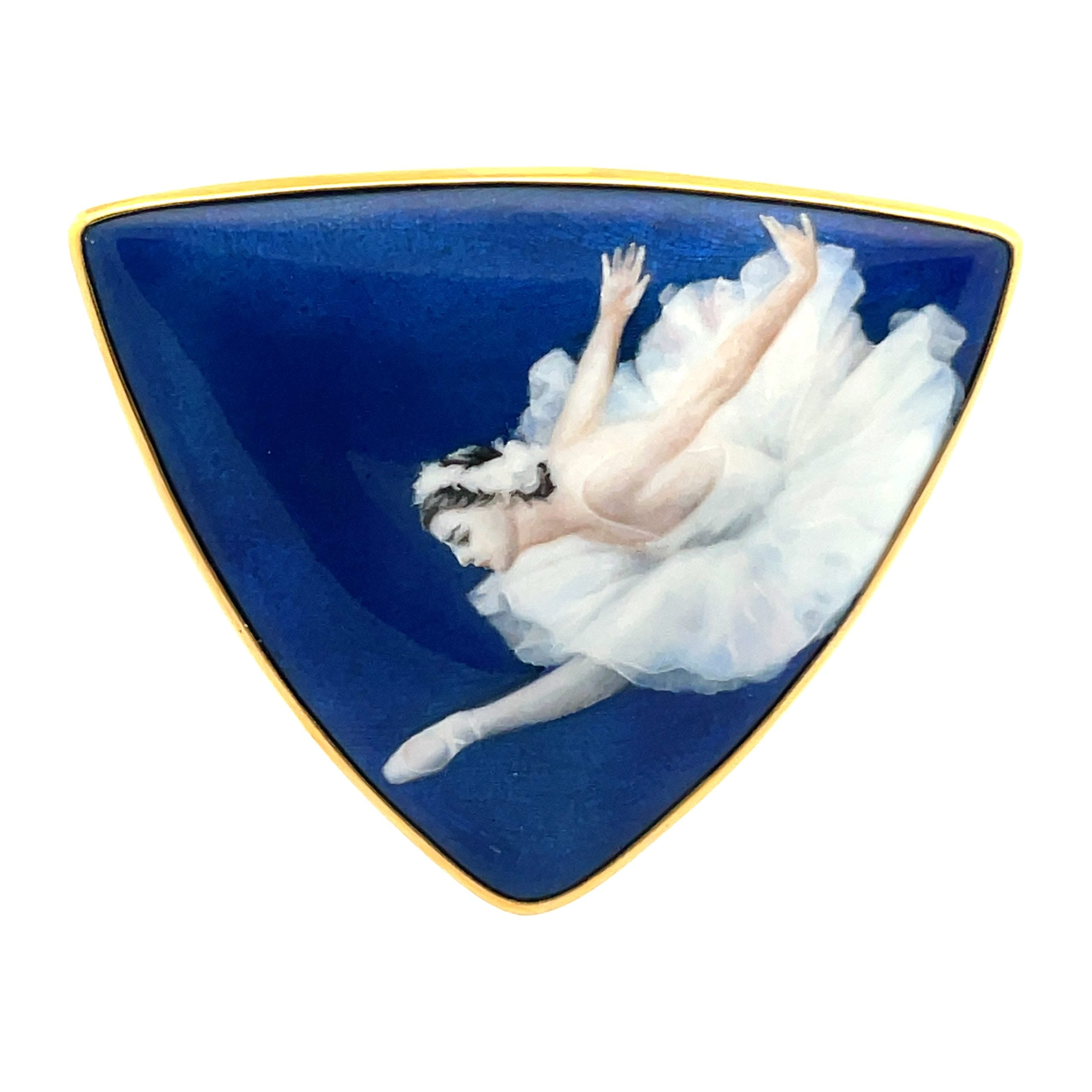 'The Swan' by Larissa Podgoretz captures the dramatic stylization and movement of the prima ballerina in 'Swan Lake', seen against a radiant blue background in this singular Limoges enamel. The triangular pendant/brooch measures 2-1/4" x 1-3/4"