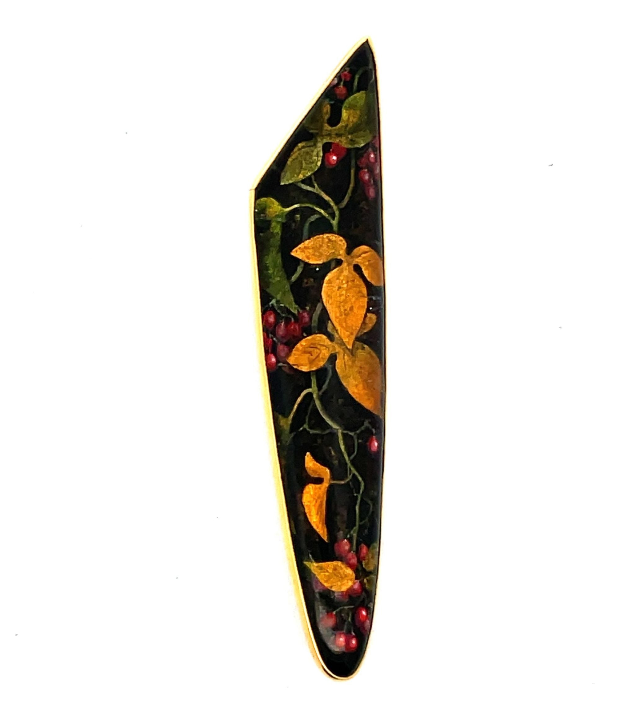 The detail, luminosity and delicacy of Larissa Podgoretz's Limoges enamel jewelry is celebrated for good reason. Here, an asymmetrical lapel brooch measuring 3/8" x 3-1/2", glows with the autumn gold of the leaves and the looming red berries.
