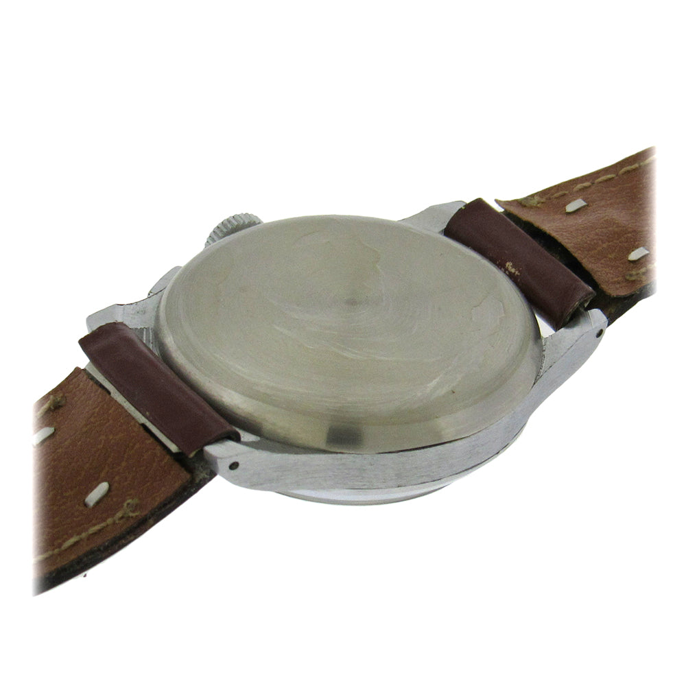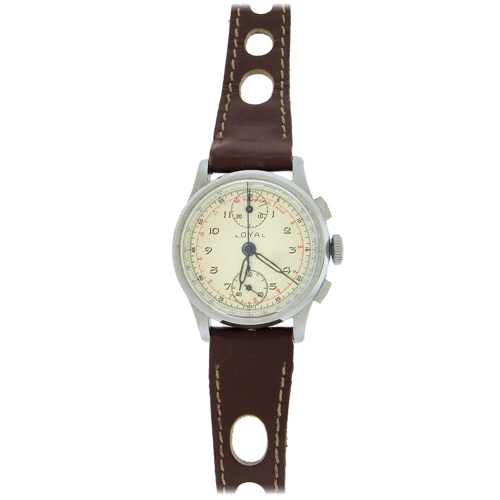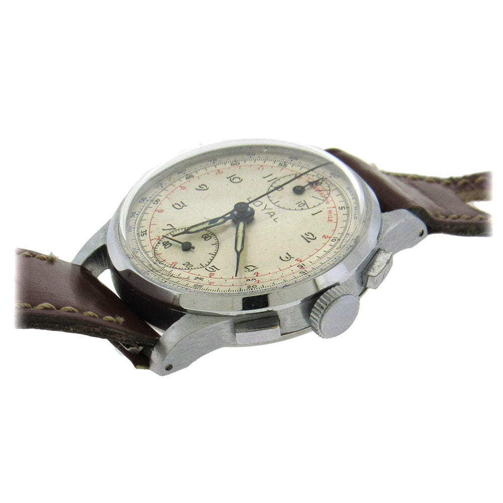 The mid-20th century brought flight and war to the forefront of the world, and during this period, 1940 to 1950, the Swiss watch industry turned out mechanical accurate chronographs for pilots, navigators, officers and the military. Today, these watches are still accurate, but their design is what drives the collectors market. This 33.5mm stainless steel Swiss chronograph, brand Loyal in excellent condition, has a snap back with square-button chronograph, register, telemeter and tachometer scales in red and blue. The silver dial features painted Arabic hours, outer minutes and fifths of a second track concentric with red 0-20 telemetric scale, outermost blue 1000-60 km/h tachometer scale, subsidiary dials for the seconds and 30-minute register, and black silhouette hands.The 17 jewels Venus manual wind movement is warrantied by Aaron Faber for 12 months.