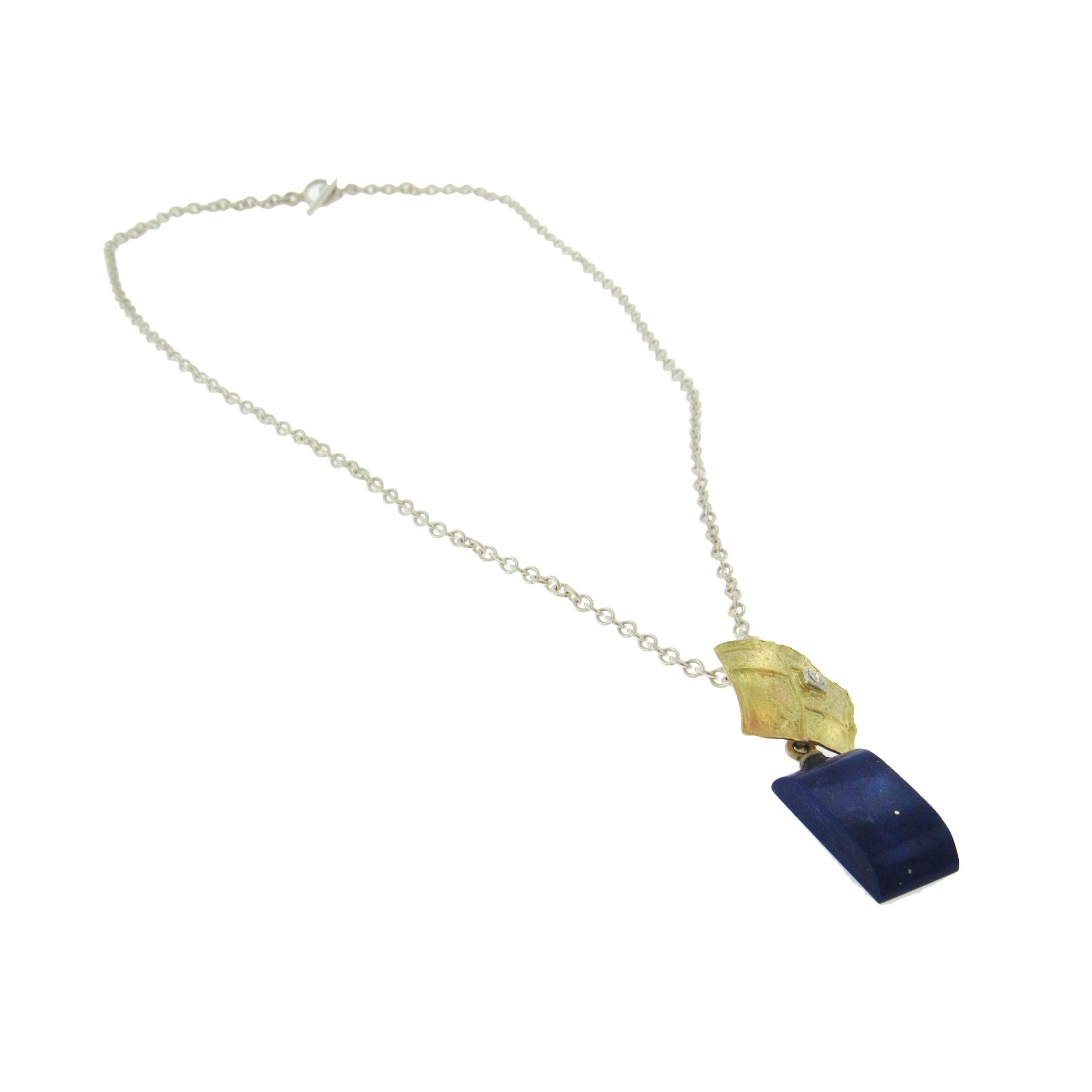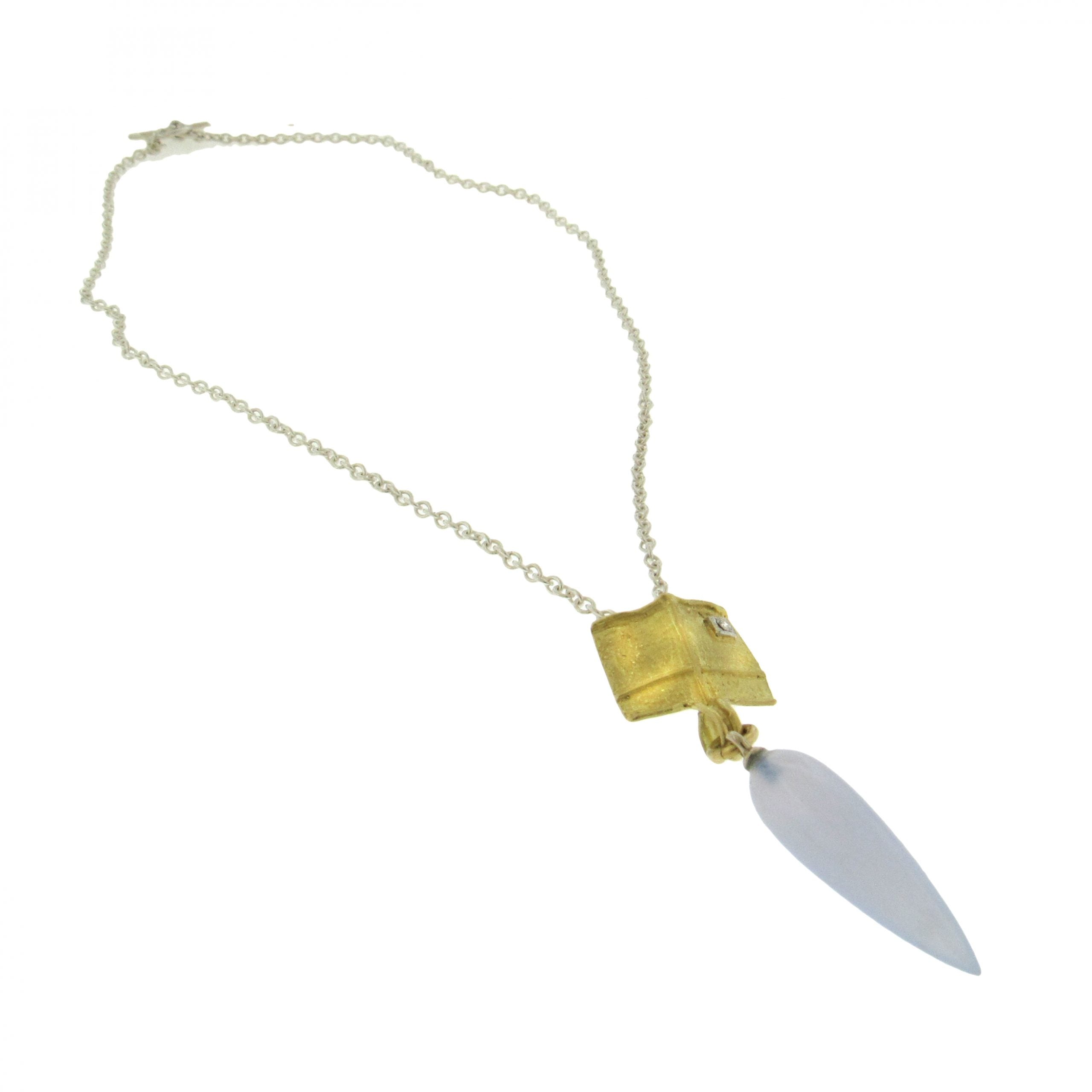 18K yellow and white textured gold blue chalcedony briolette pendant from Marco Borghesi is accented at top with diamond, 0.02cts tw, and measures 3/4" x 2-1/4" overall, accompanied by a sterling silver chain, 16-1/2" long.
