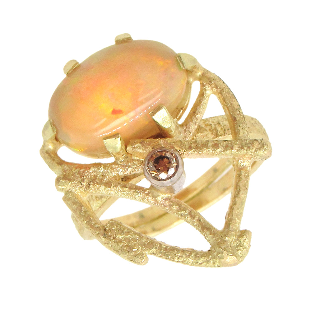 Shimmering orange, blue and green lights in this 2.55 ct oval cabochon opal is accented with 0.10 ct a champagne diamond in this openwork 18K gold ring by Marco Borghesi, measures 3/4" x 7/8",size 7-1/2, adjustable.