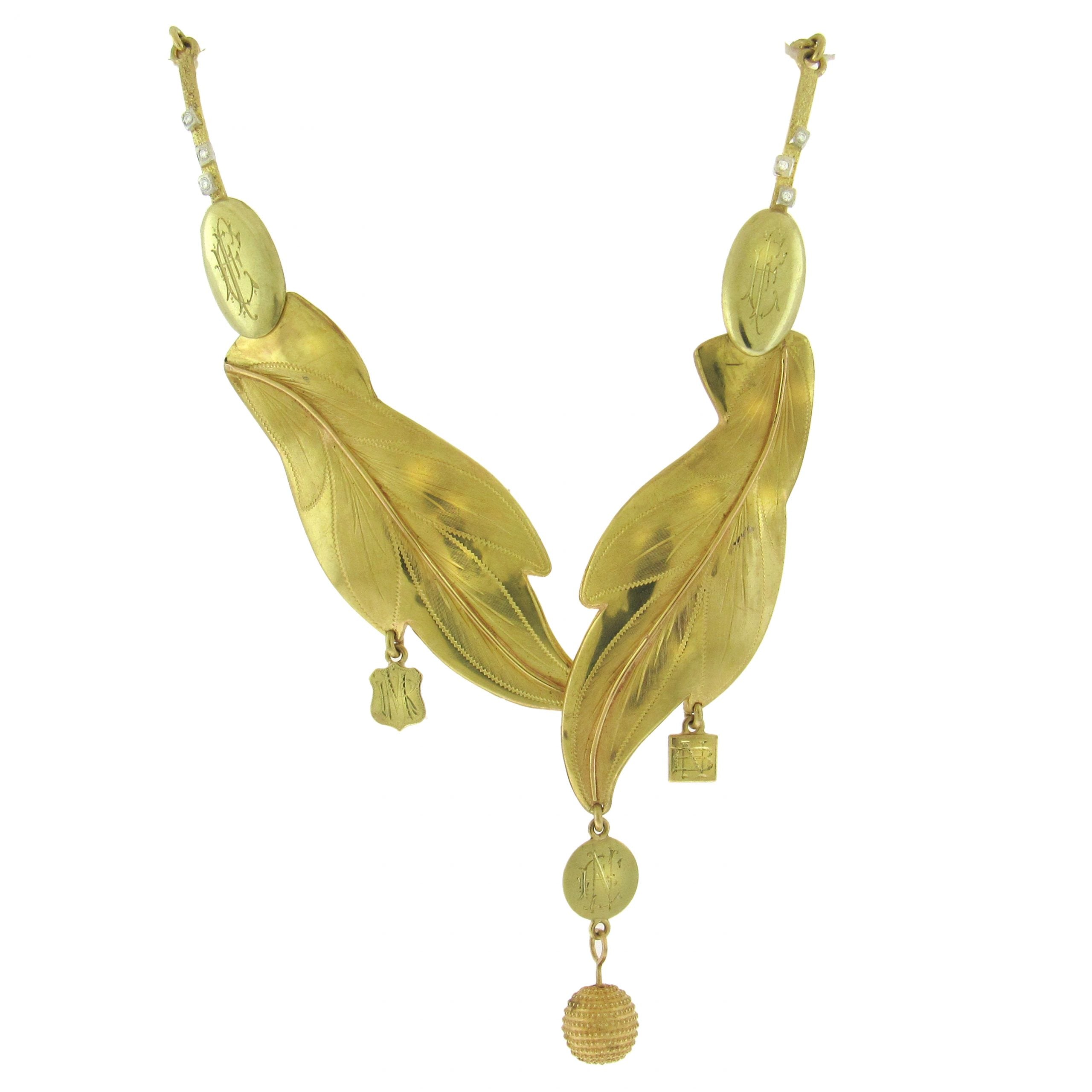 Marco Borghesi 18K gold Retro necklace features a central curved and hammered double leaf design accented with found object engraved charms, a granulated gold drop, and a hammered link necklace set with 0.12 cts diamonds. The necklace measures 23" overall, 1-1/4" at the widest.