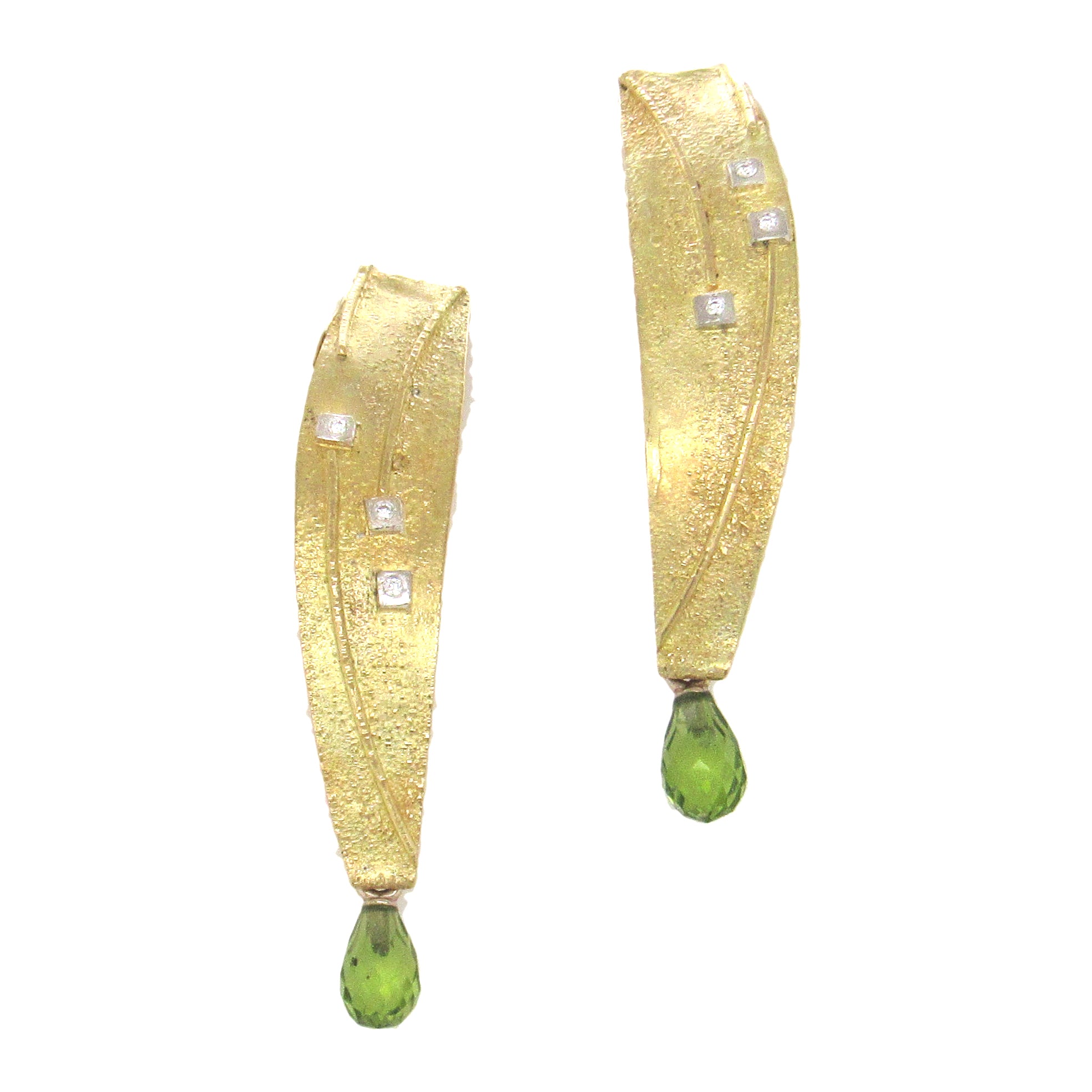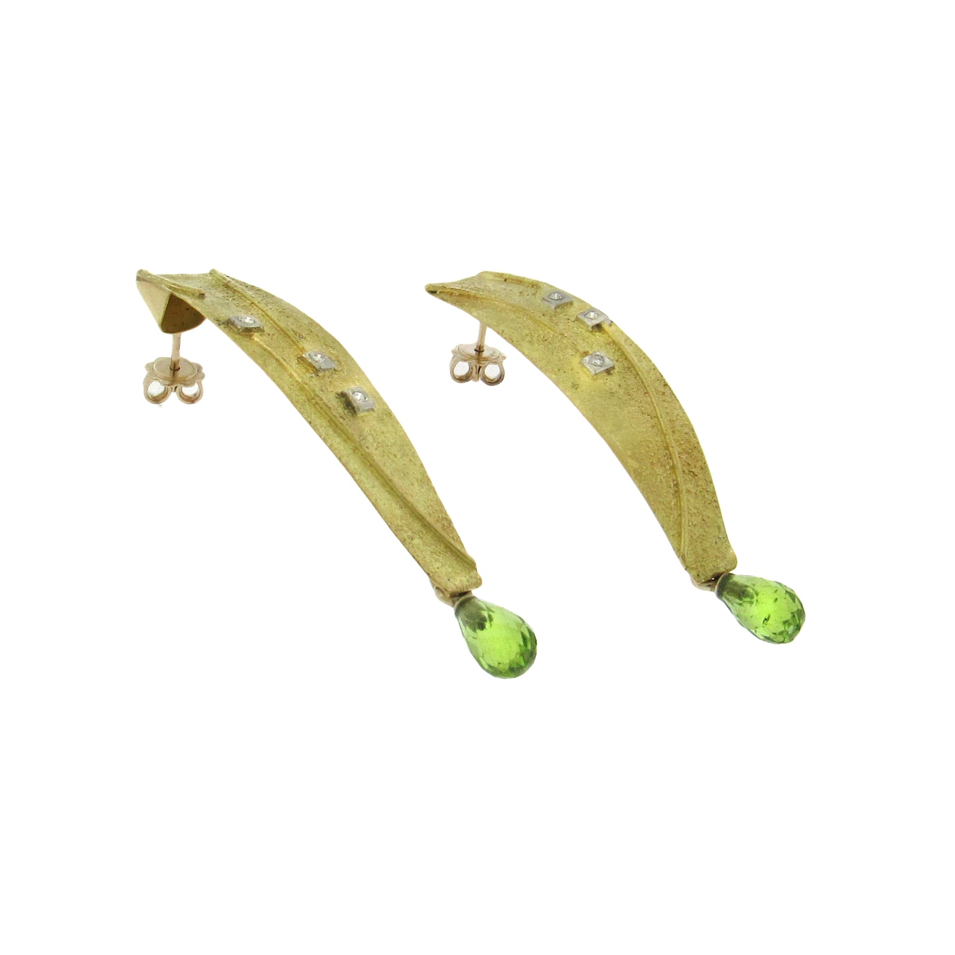18K yellow gold, diamond and peridot drop day/night earrings by Marco Borghesi measure 1/2" x 3" long, the peridot briolette is removable.