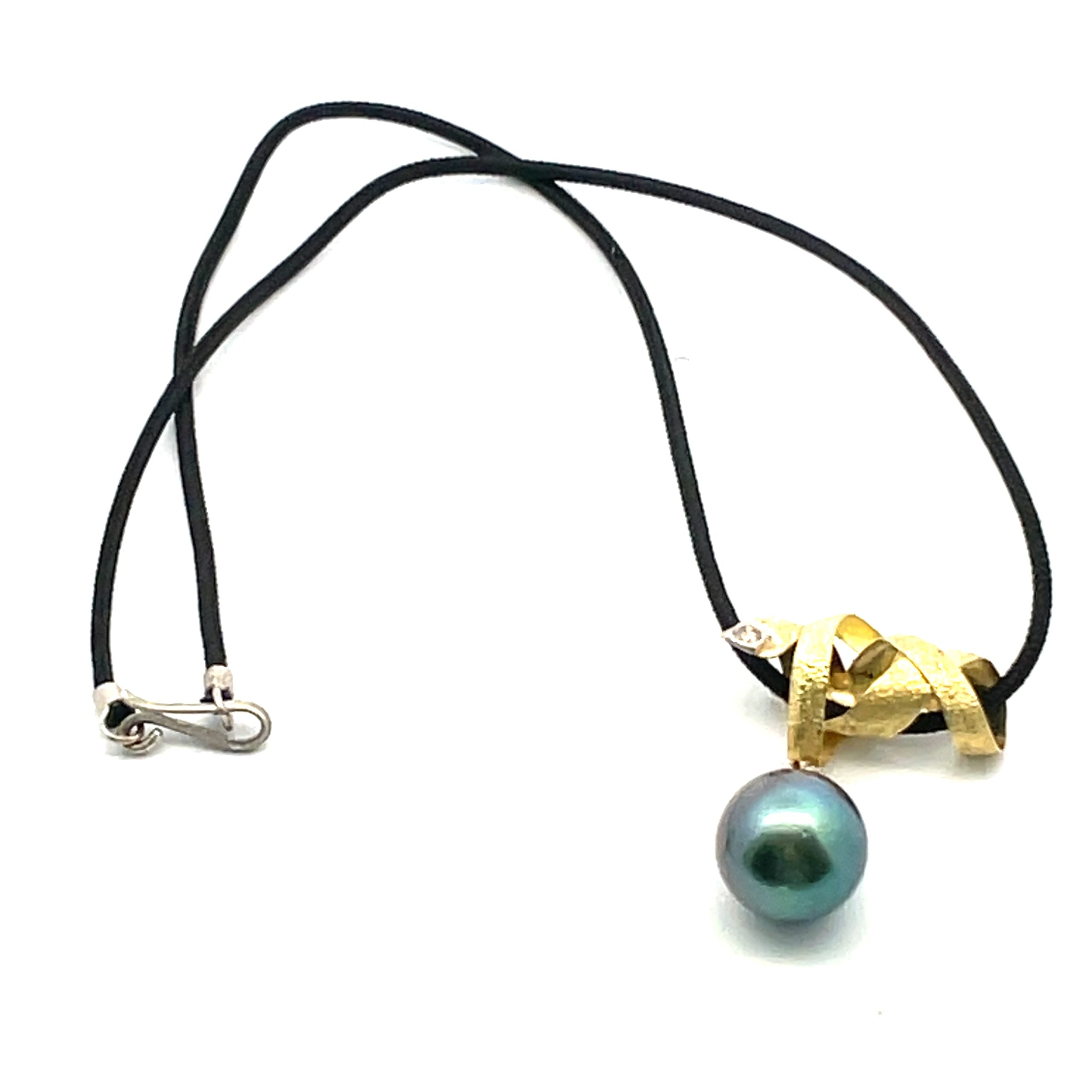 Luxury for real life: a magnificent 14mm Tahiti peacock pearl drop set with a small white and a small brown diamond in Marco Borghesi's ribbon 18K gold textured day-night pendant necklace on a black grosgrain cord, 17-3/4" long with sterling shepherd's hook clasp. The pendant measures 1-1/4" x 1-1/2" x 1/2" diameter.