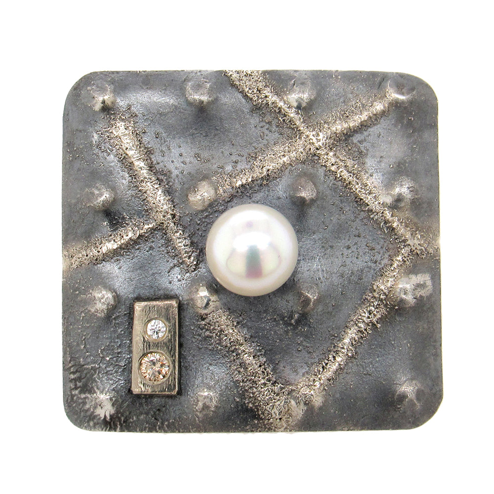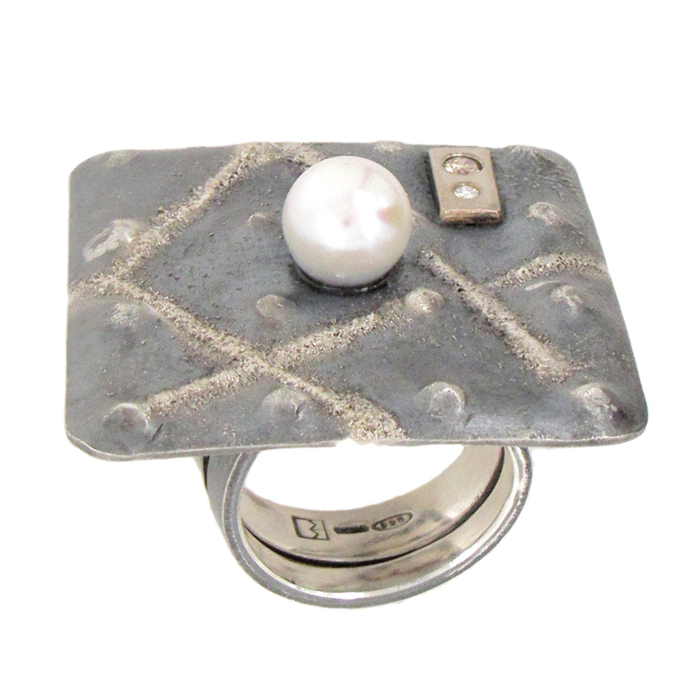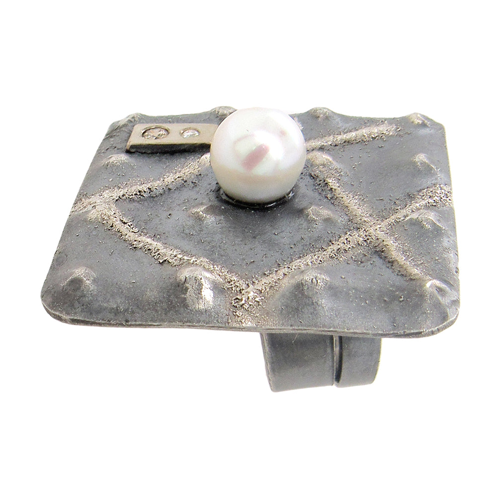 Marco Borghesi's textured silver square with 18K gold accents is set at center with a 9mm pearl, accented with a a .02 ct white diamond and 0.12 ct champagne diamond. The ring measures 1-1/2" x 1-1/2" . Size 7-1/2, adjustable.